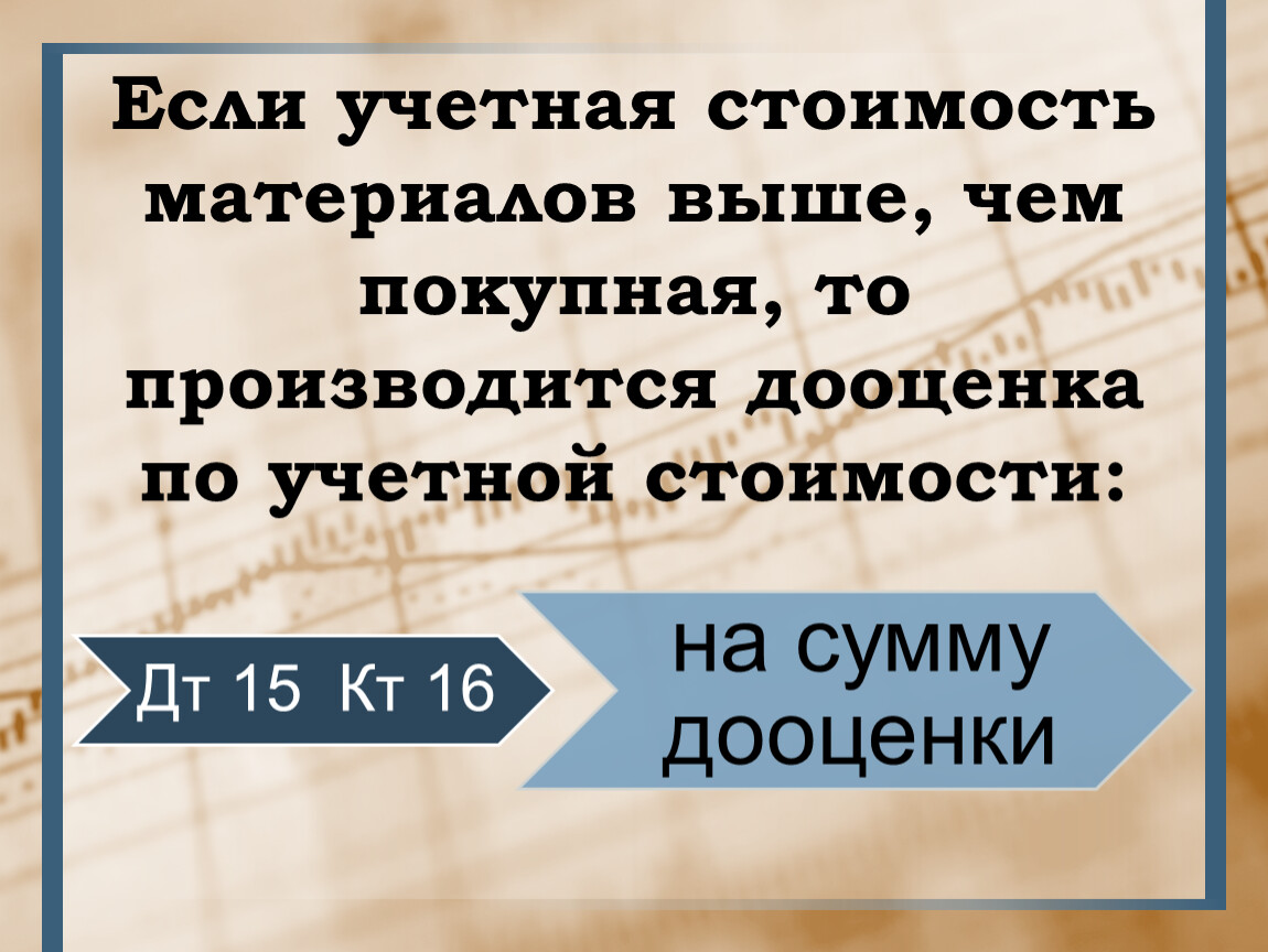 Если учетная стоимость материалов выше, чем покупная, то производится дооценка по учетной стоимости: