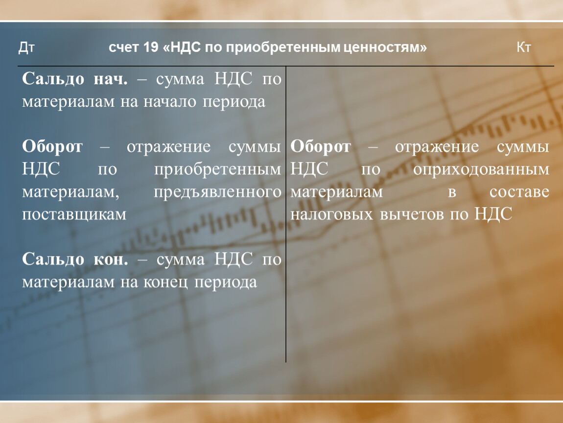Дт счет 19 «НДС по приобретенным ценностям» Кт