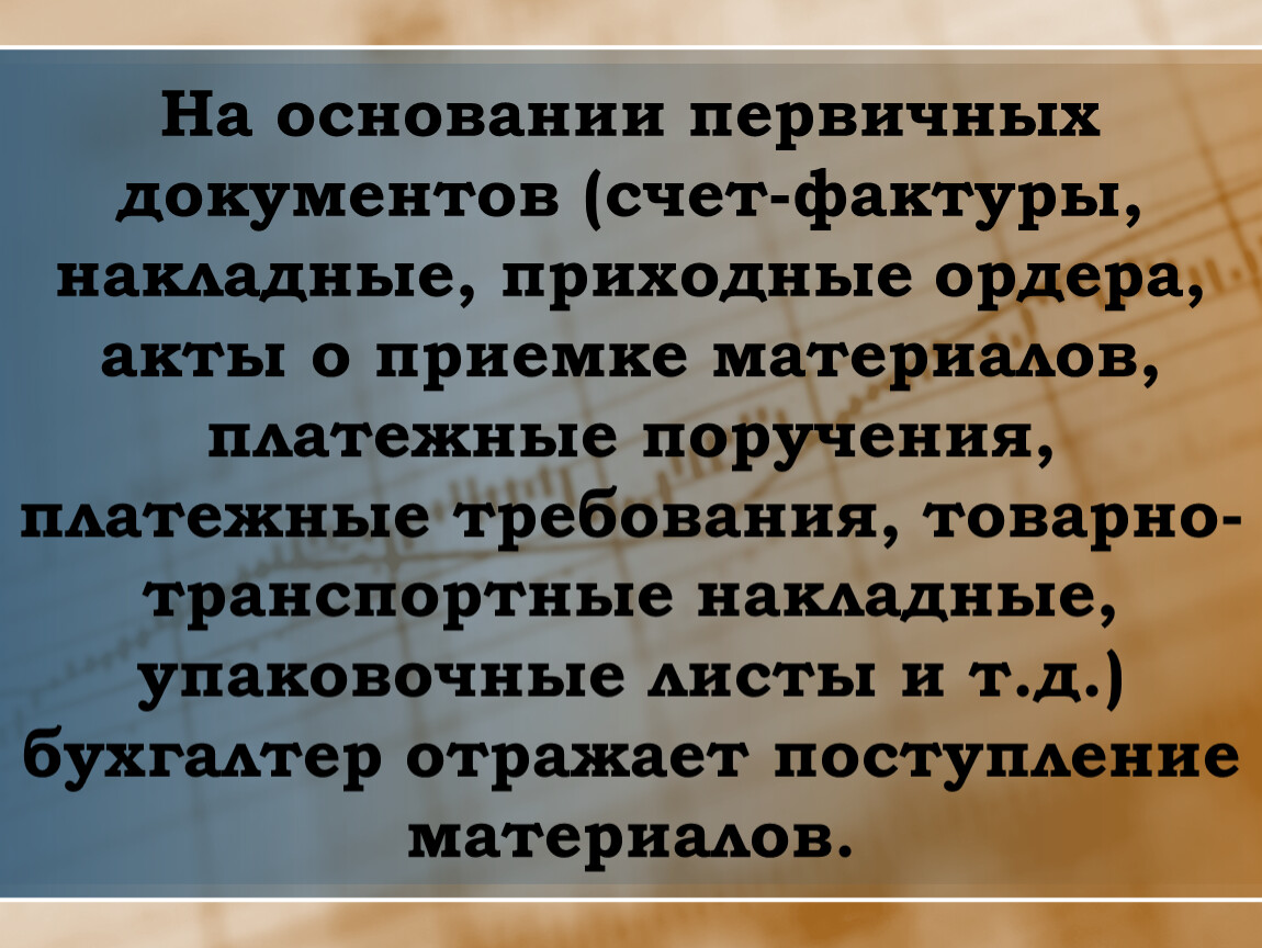 На основании первичных документов (счет-фактуры, накладные, приходные ордера, акты о приемке материалов, платежные поручения, платежные требования, товарно-транспортные накладные, упаковочные листы и т.д.) бухгалтер отражает поступление материалов.