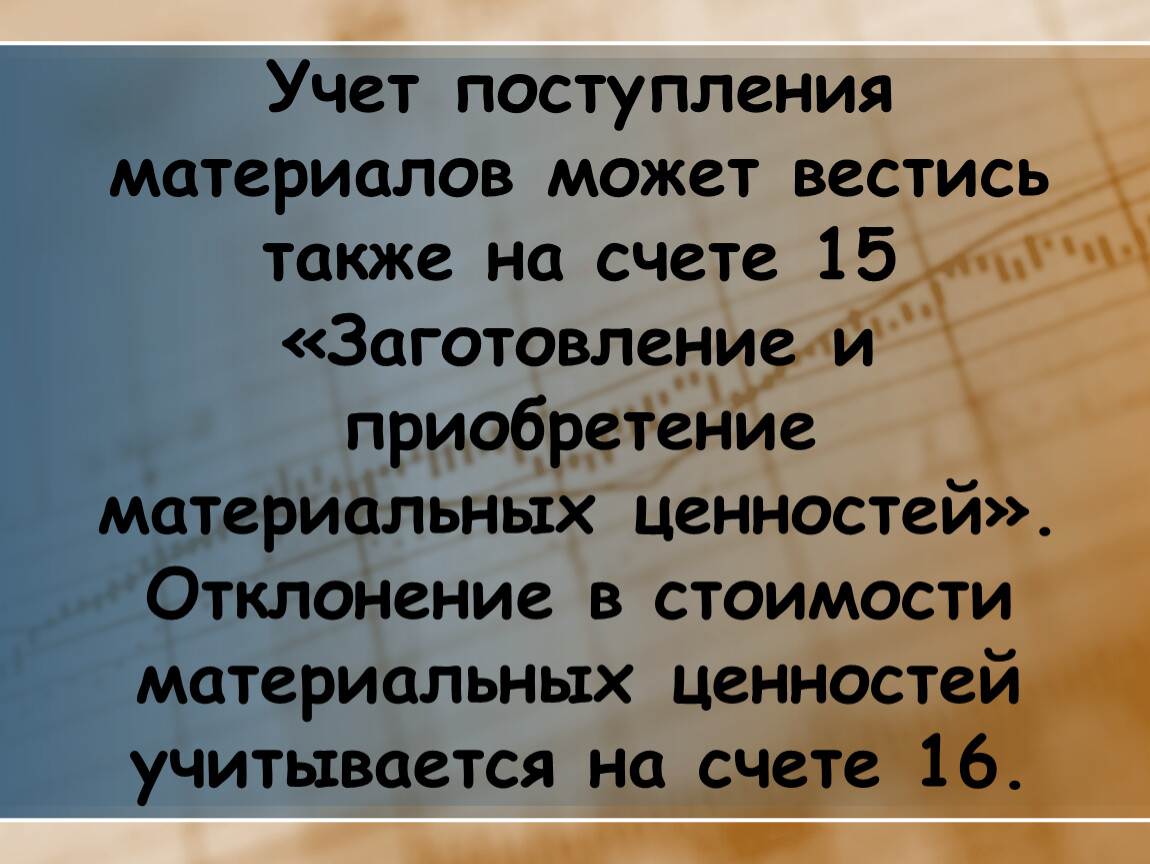 Учет поступления материалов может вестись также на счете 15 «Заготовление и приобретение материальных ценностей». Отклонение в стоимости материальных ценностей учитывается на счете 16.
