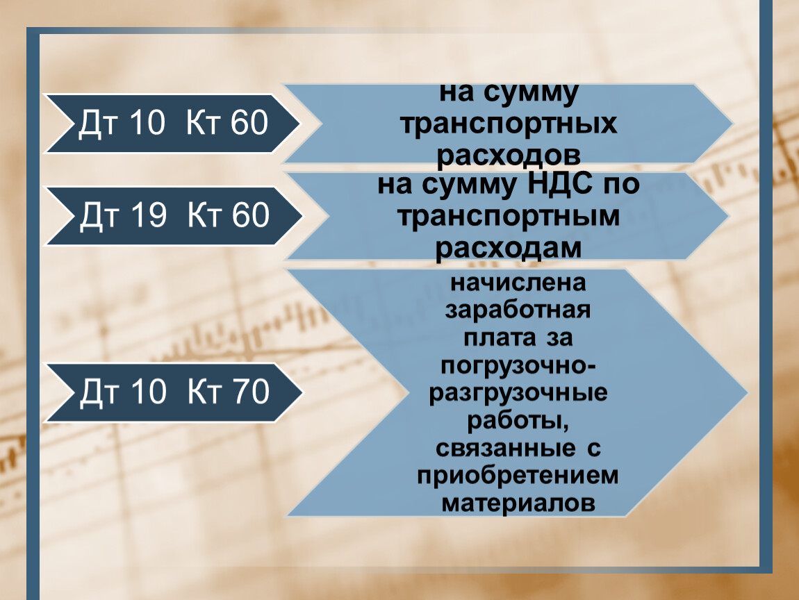 расходы на транспортировку и доставку материалов от поставщиков до склада производственного предприятия железнодорожным, автомобильным, водным транспортом;