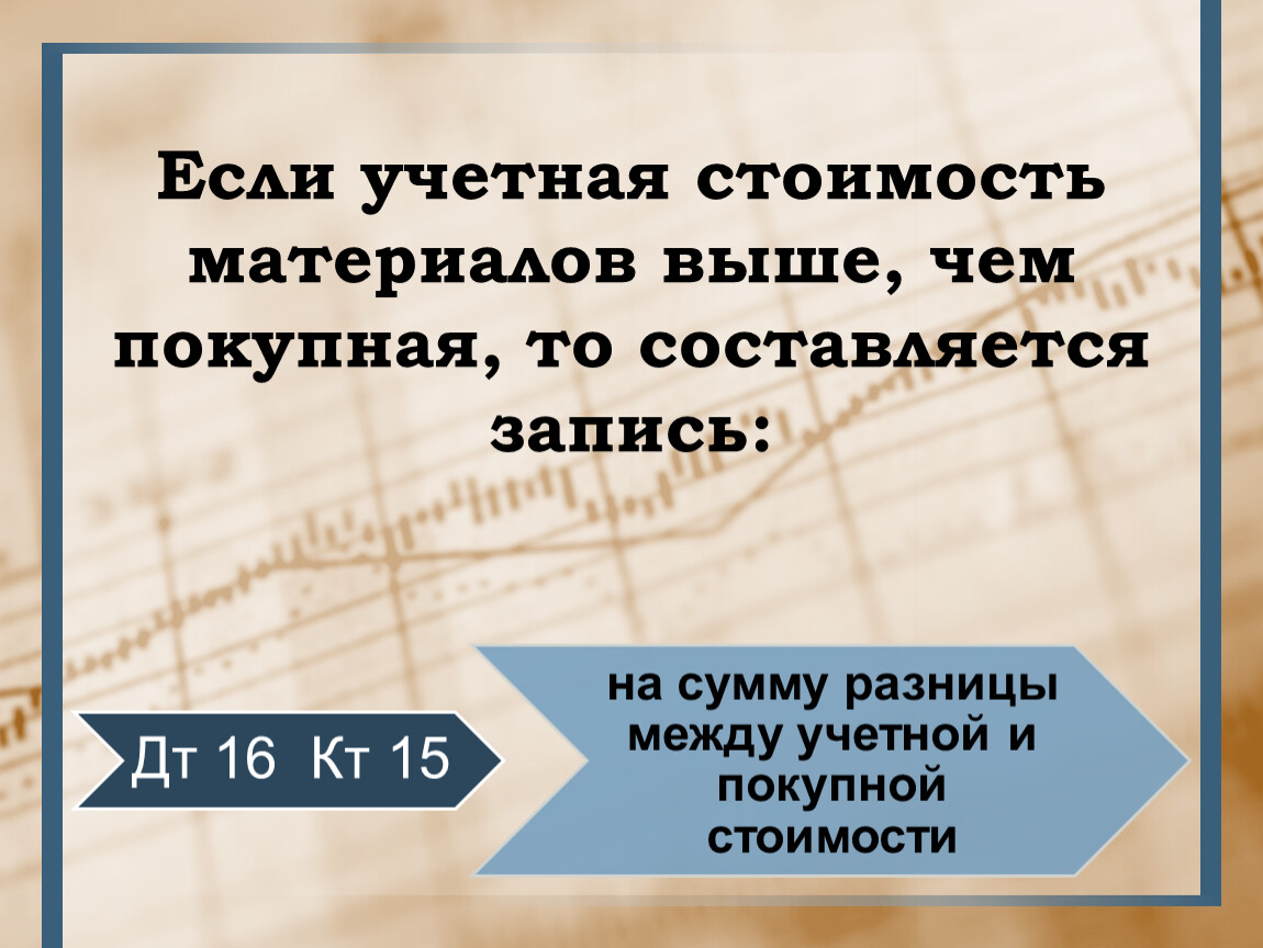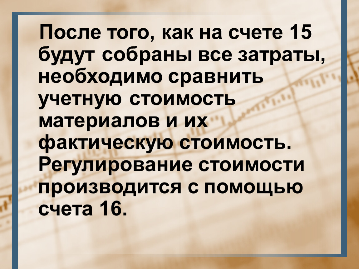 После того, как на счете 15 будут собраны все затраты, необходимо сравнить учетную стоимость материалов и их фактическую стоимость. Регулирование стоимости производится с помощью счета 16.