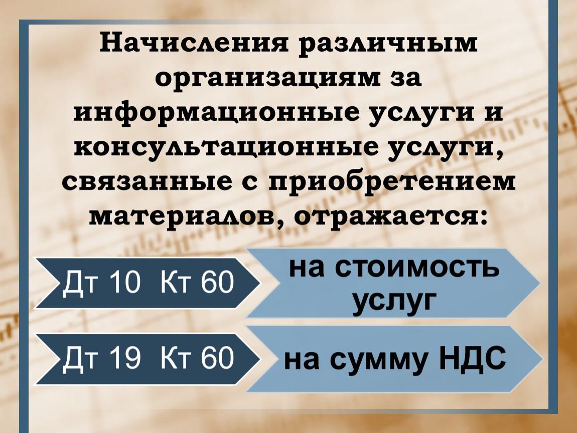 Начисления различным организациям за информационные услуги и консультационные услуги, связанные с приобретением материалов, отражается:
