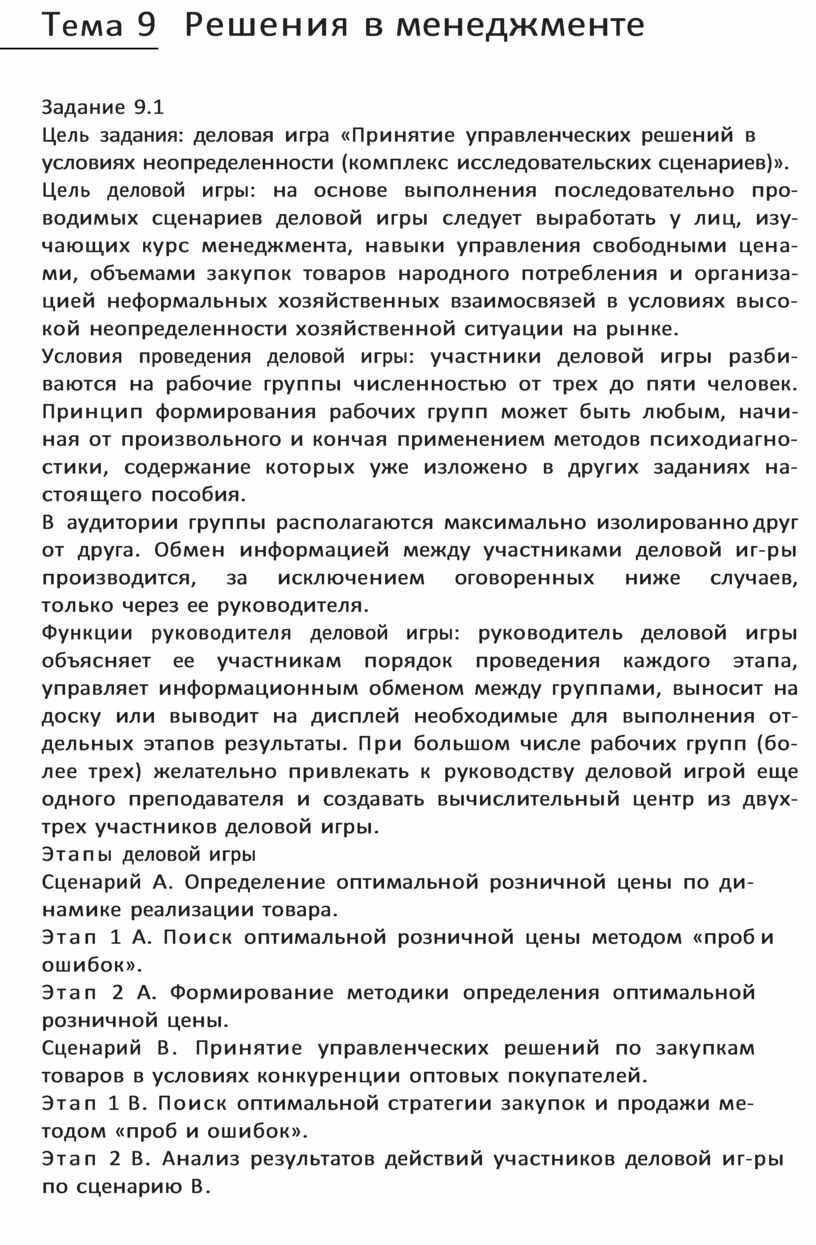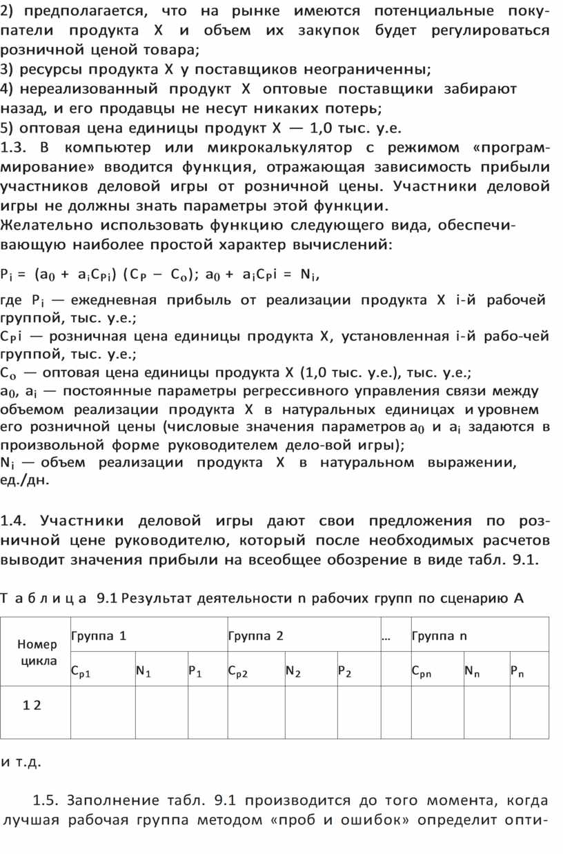 1.4. Участники деловой игры дают свои предложения по роз-ничной цене руководителю, который после необходимых расчетов выводит значения прибыли на всеобщее обозрение в виде табл. 9.1.