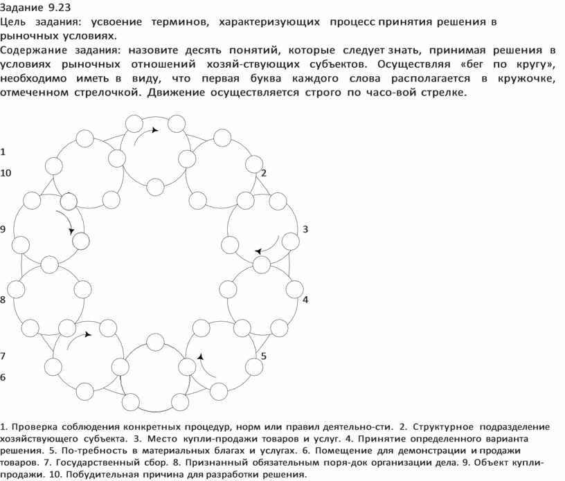 Содержание задания: назовите десять понятий, которые следует знать, принимая решения в условиях рыночных отношений хозяй-ствующих субъектов. Осуществляя «бег по кругу», необходимо иметь в виду, что первая буква каждого слова располагается в кружочке, отмеченном стрелочкой. Движение осуществляется строго по часо-вой стрелке.