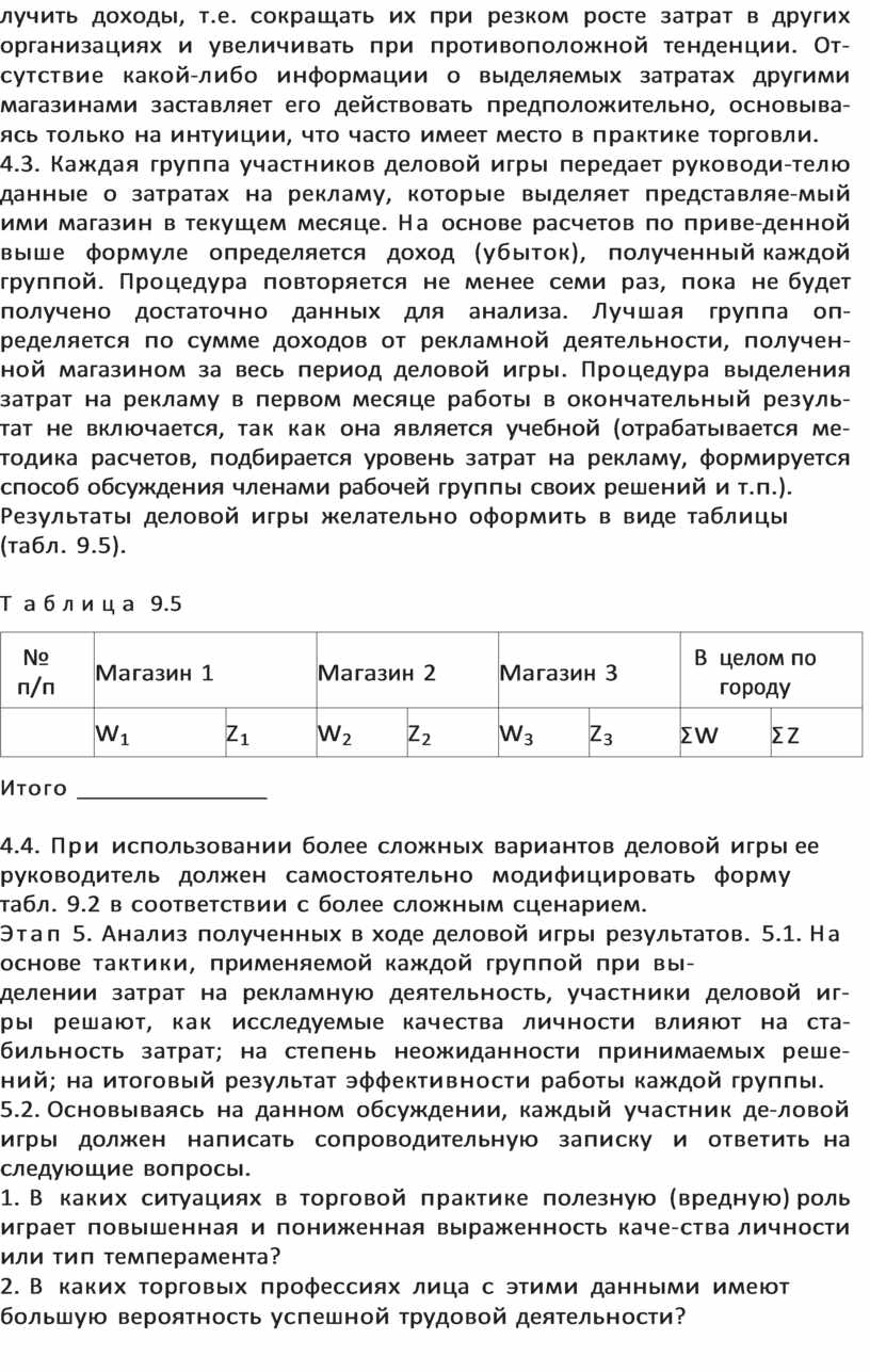 Результаты деловой игры желательно оформить в виде таблицы (табл. 9.5).