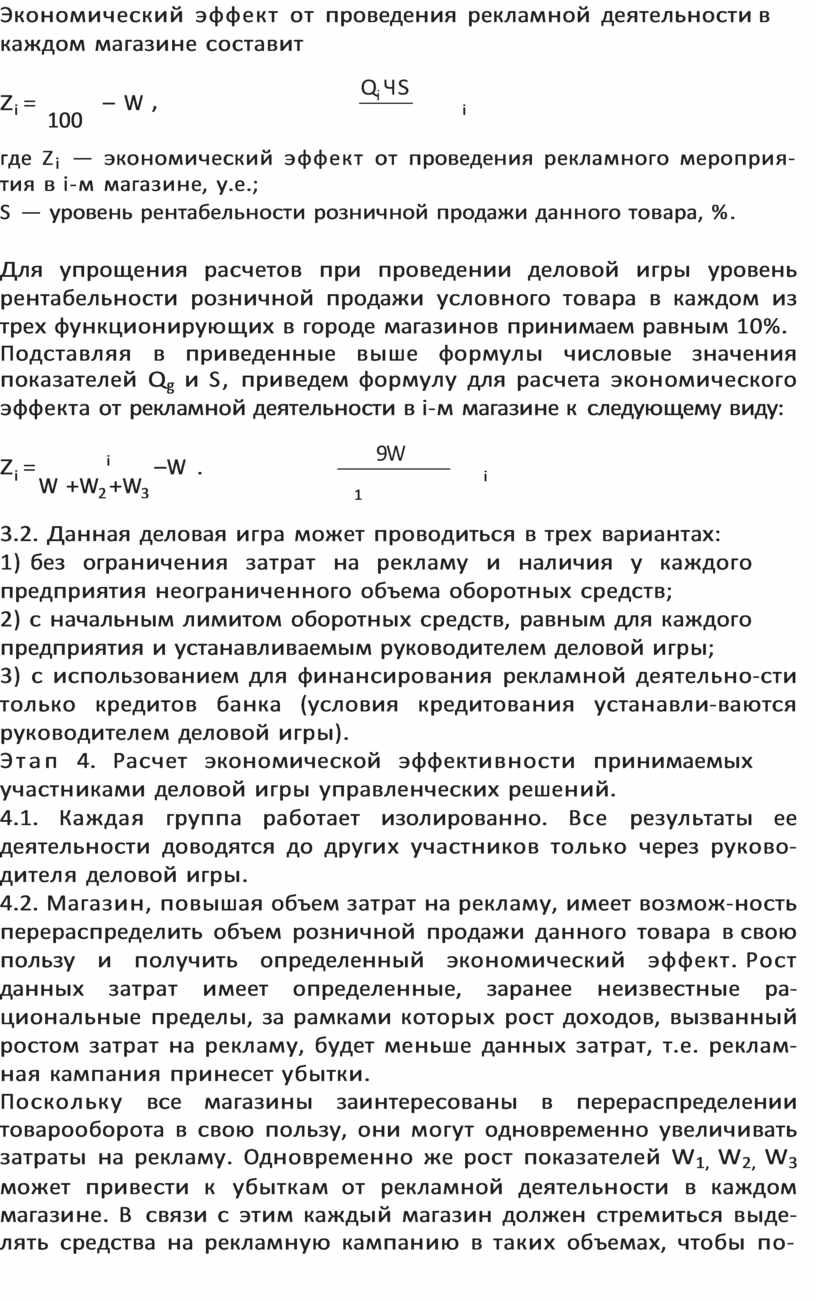 4.3. Каждая группа участников деловой игры передает руководи-телю данные о затратах на рекламу, которые выделяет представляе-мый ими магазин в текущем месяце. На основе расчетов по приве-денной выше формуле определяется доход (убыток), полученный каждой группой. Процедура повторяется не менее семи раз, пока не будет получено достаточно данных для анализа. Лучшая группа оп-ределяется по сумме доходов от рекламной деятельности, получен-ной магазином за весь период деловой игры. Процедура выделения затрат на рекламу в первом месяце работы в окончательный резуль-тат не включается, так как она является учебной (отрабатывается ме-тодика расчетов, подбирается уровень затрат на рекламу, формируется способ обсуждения членами рабочей группы своих решений и т.п.).