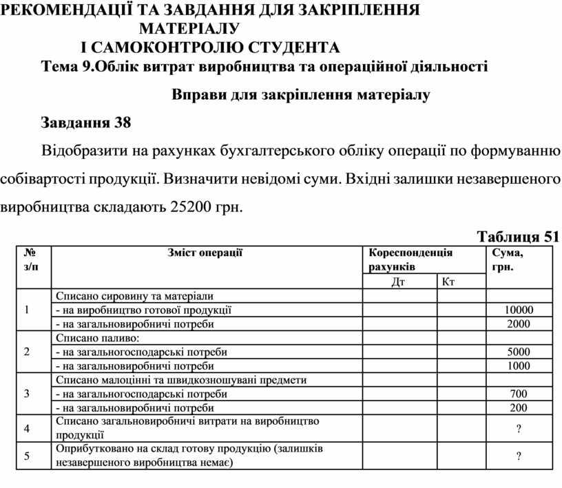 Відобразити на рахунках бухгалтерського обліку операції по формуванню собівартості продукції. Визначити невідомі суми. Вхідні залишки незавершеного виробництва складають 25200 грн.