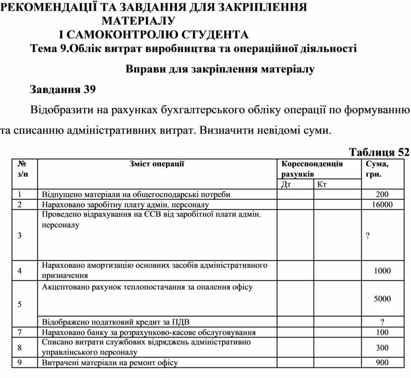 Відобразити на рахунках бухгалтерського обліку операції по формуванню та списанню адміністративних витрат. Визначити невідомі суми.
