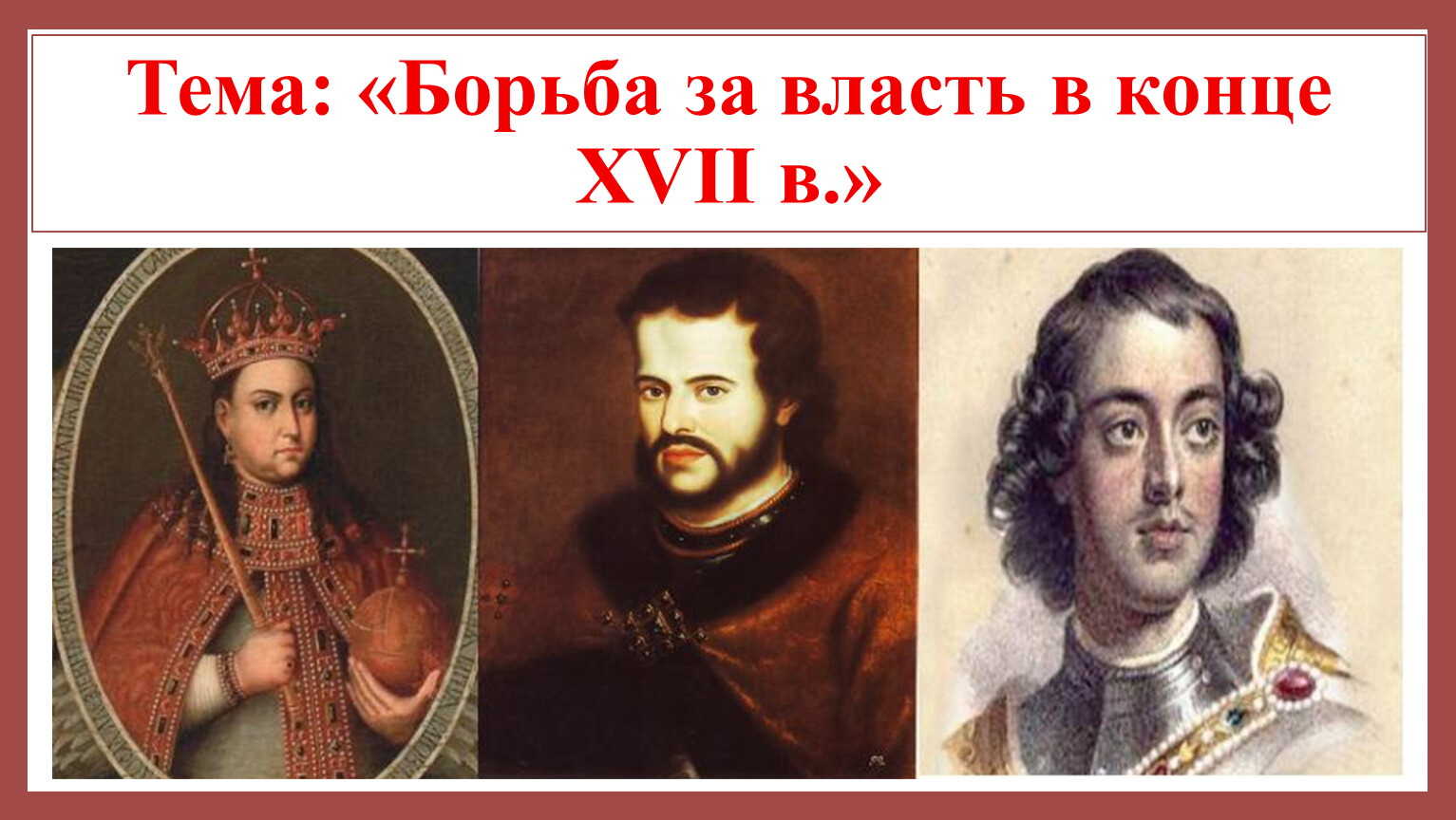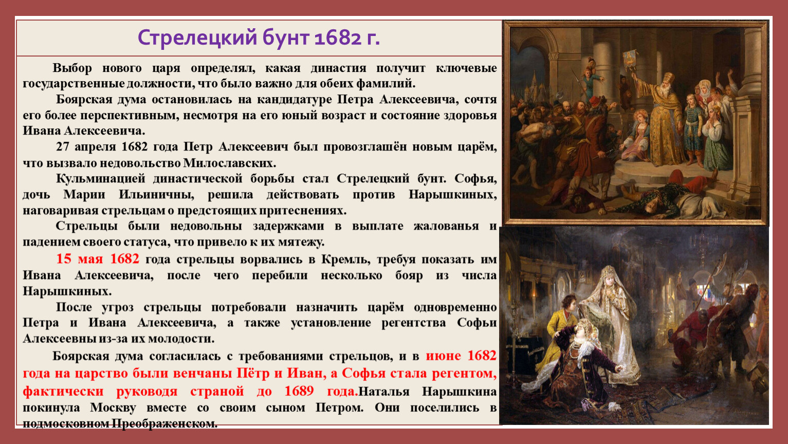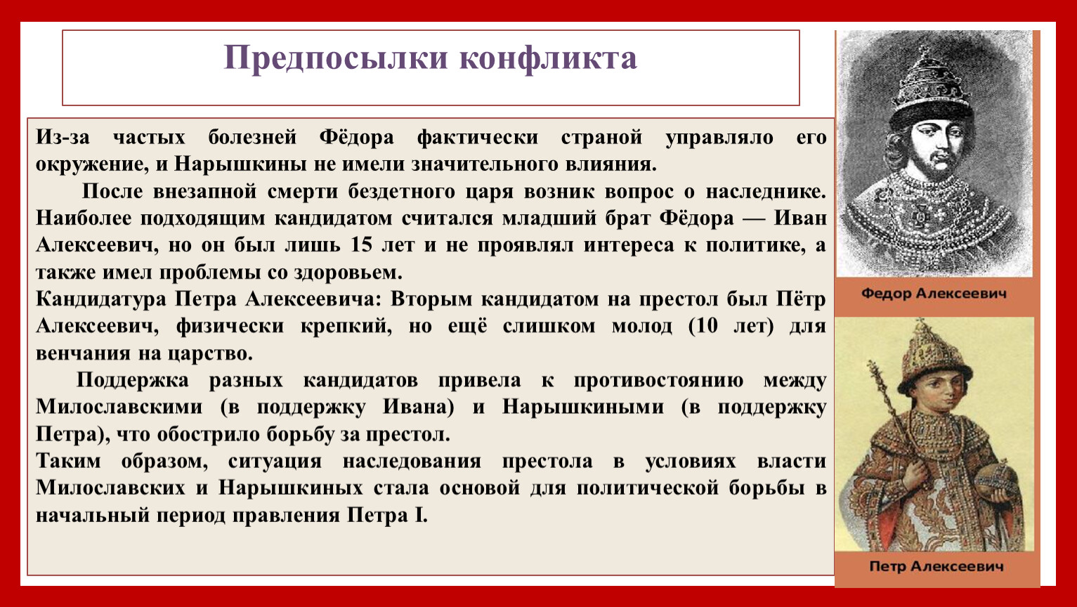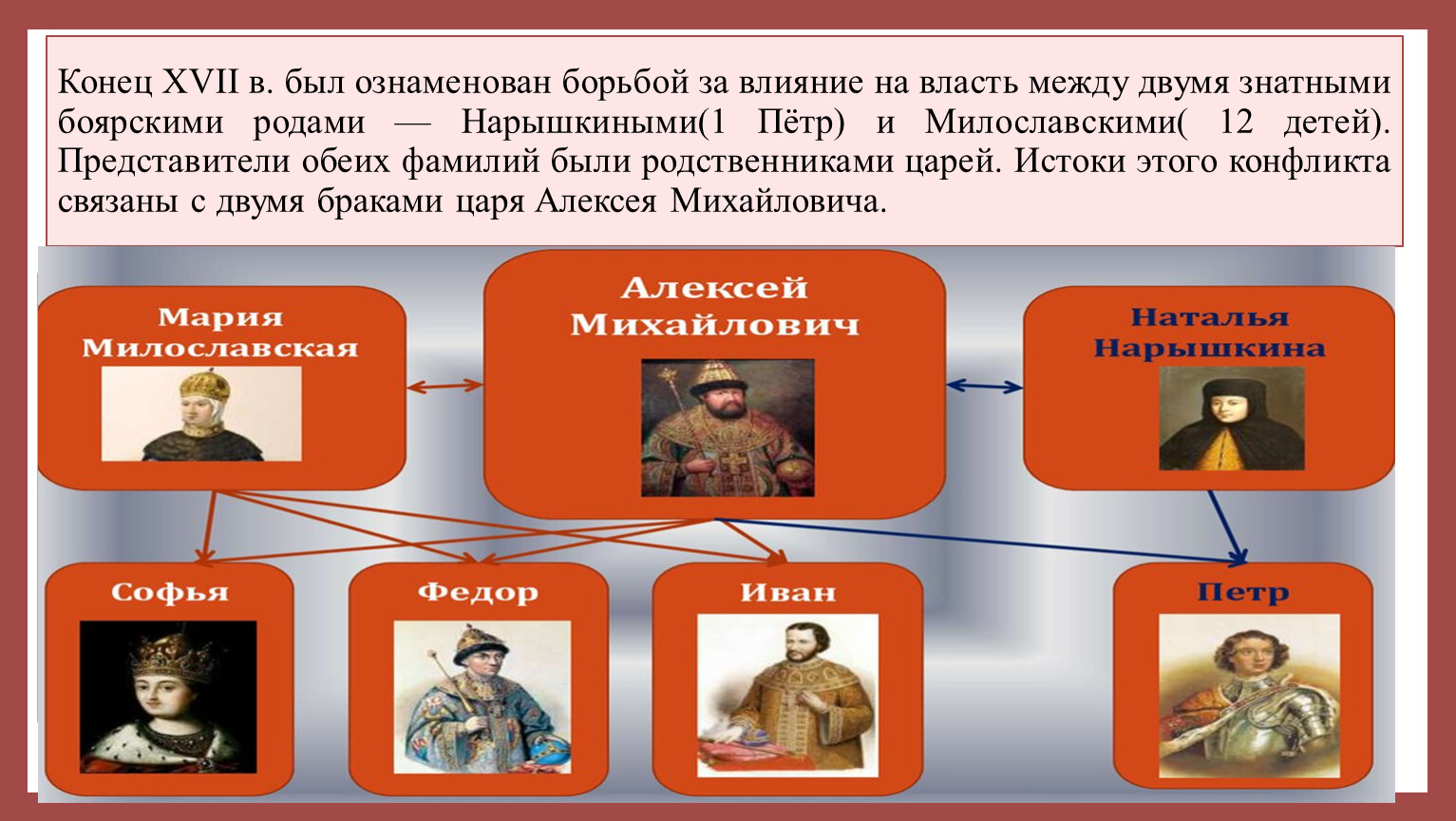 Конец XVII в. был ознаменован борьбой за влияние на власть между двумя знатными боярскими родами — Нарышкиными(1 Пётр) и Милославскими( 12 детей). Представители обеих фамилий были родственниками царей. Истоки этого конфликта связаны с двумя браками царя Алексея Михайловича.