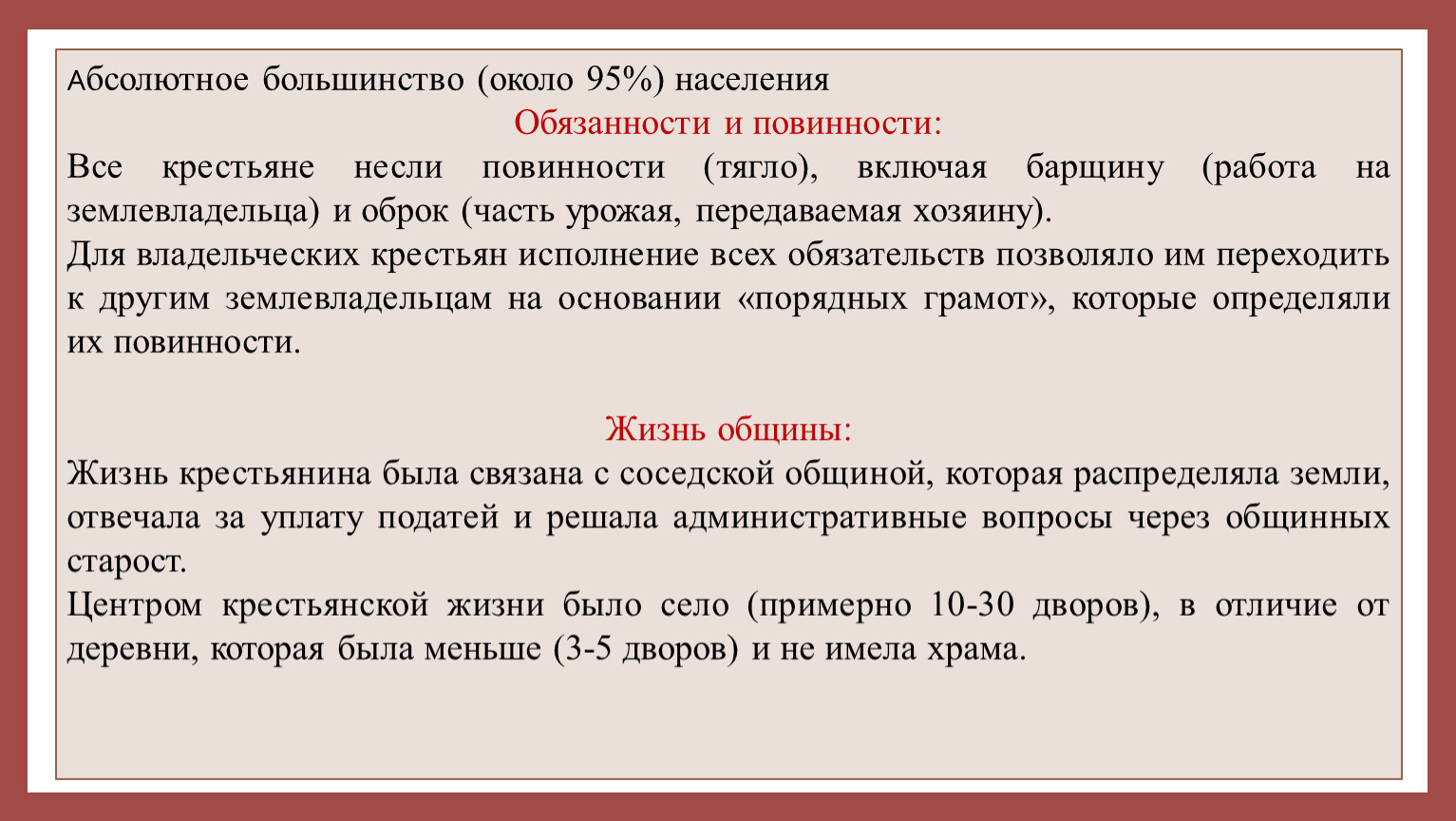Все крестьяне несли повинности (тягло), включая барщину (работа на землевладельца) и оброк (часть урожая, передаваемая хозяину).
