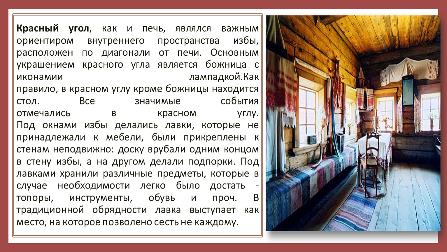 Красный угол, как и печь, являлся важным ориентиром внутреннего пространства избы, расположен по диагонали от печи. Основным украшением красного угла является божница с иконамии лампадкой.Как правило, в красном углу кроме божницы находится стол. Все значимые события отмечались в красном углу.Под окнами избы делались лавки, которые не принадлежали к мебели, были прикреплены к стенам неподвижно: доску врубали одним концом в стену избы, а на другом делали подпорки. Под лавками хранили различные предметы, которые в случае необходимости легко было достать - топоры, инструменты, обувь и проч. В традиционной обрядности лавка выступает как место, на которое позволено сесть не каждому.