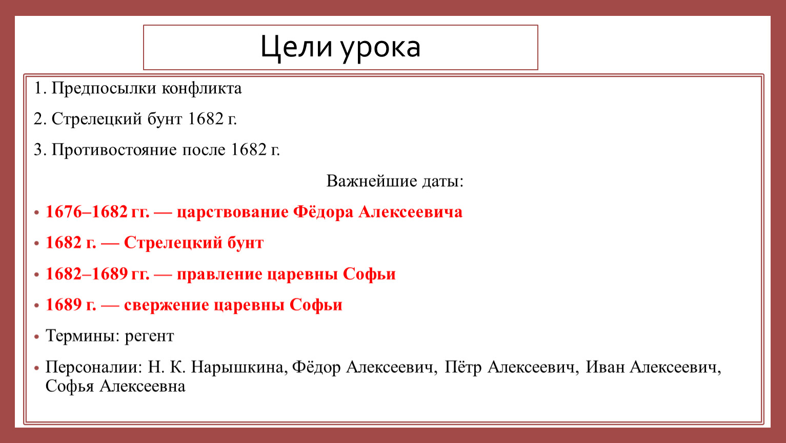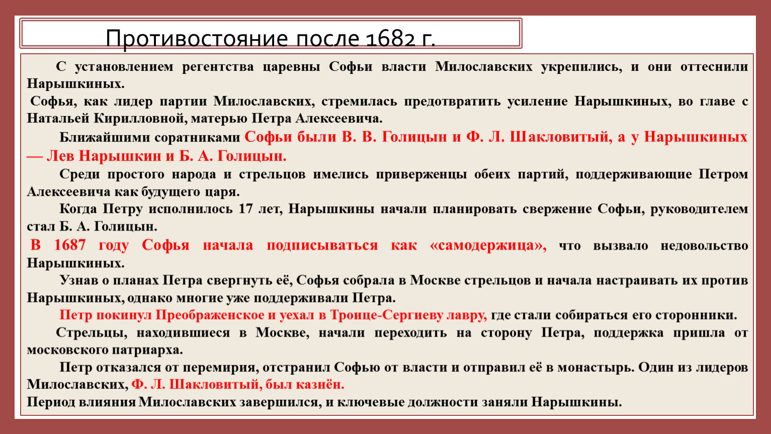Софья, как лидер партии Милославских, стремилась предотвратить усиление Нарышкиных, во главе с Натальей Кирилловной, матерью Петра Алексеевича.