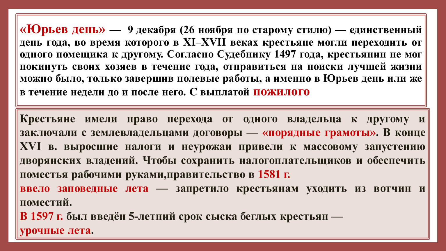 «Юрьев день» — 9 декабря (26 ноября по старому стилю) — единственный день года, во время которого в XI–XVII веках крестьяне могли переходить от одного помещика к другому. Согласно Судебнику 1497 года, крестьянин не мог покинуть своих хозяев в течение года, отправиться на поиски лучшей жизни можно было, только завершив полевые работы, а именно в Юрьев день или же в течение недели до и после него. С выплатой пожилого