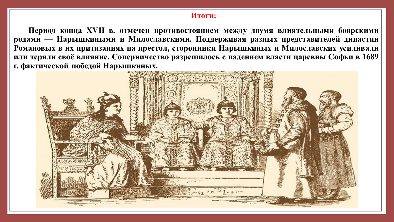 Период конца XVII в. отмечен противостоянием между двумя влиятельными боярскими родами — Нарышкиными и Милославскими. Поддерживая разных представителей династии Романовых в их притязаниях на престол, сторонники Нарышкиных и Милославских усиливали или теряли своё влияние. Соперничество разрешилось с падением власти царевны Софьи в 1689 г. фактической победой Нарышкиных.