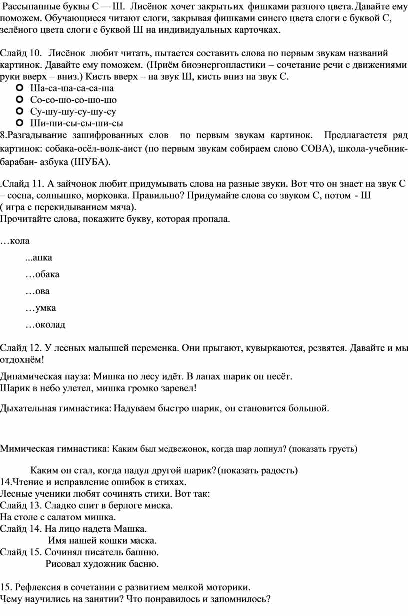 7.Слайд 10. Лисёнок любит читать, пытается составить слова по первым звукам названий картинок. Давайте ему поможем. (Приём биоэнергопластики – сочетание речи с движениями руки вверх – вниз.) Кисть вверх – на звук Ш, кисть вниз на звук С.