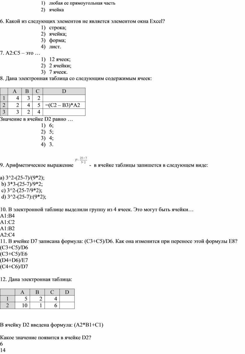 8. Дана электронная таблица со следующим содержимым ячеек: