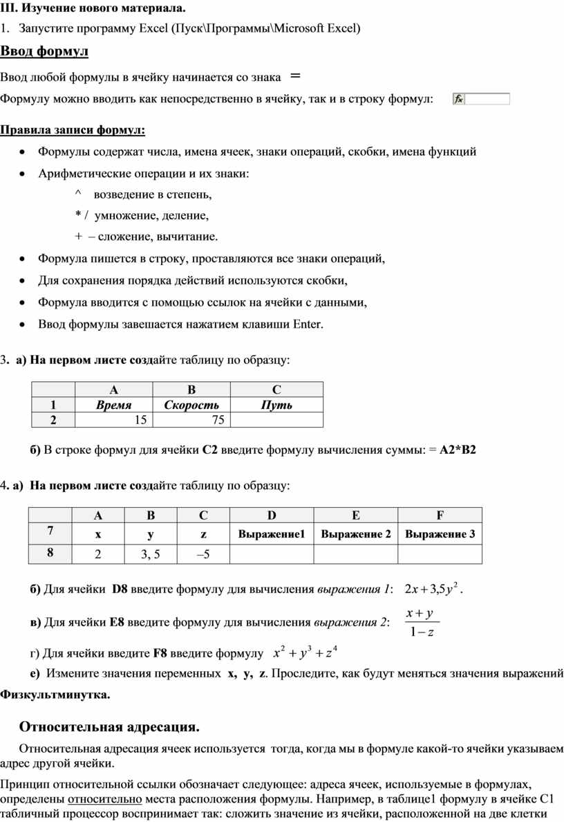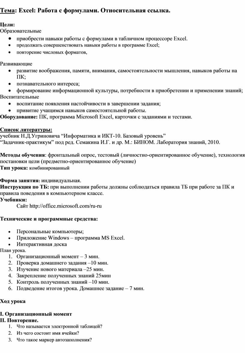 Тема: Excel: Работа с формулами. Относительная ссылка.