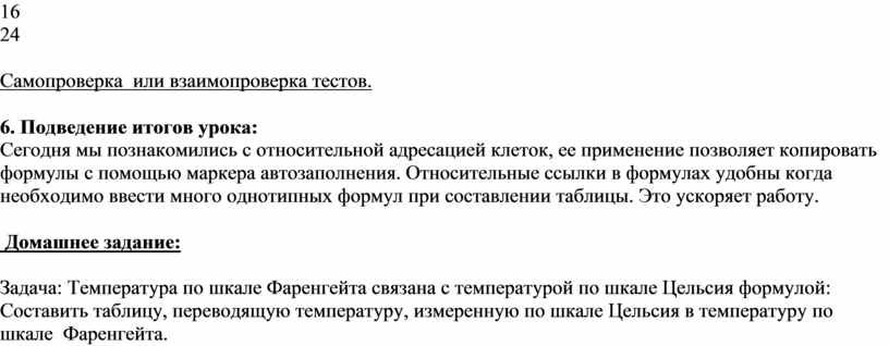 Сегодня мы познакомились с относительной адресацией клеток, ее применение позволяет копировать формулы с помощью маркера автозаполнения. Относительные ссылки в формулах удобны когда необходимо ввести много однотипных формул при составлении таблицы. Это ускоряет работу.