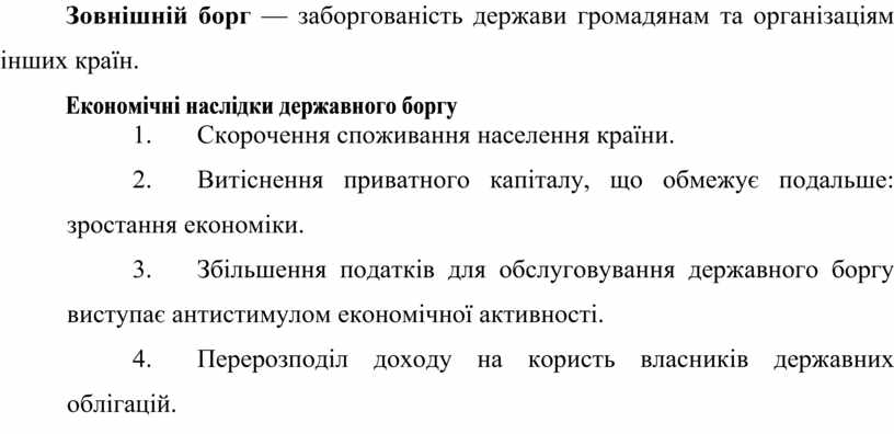 Державним (або урядовим) боргом називається нагромаджена сума позичених урядом коштів для фінансування дефіцитів.