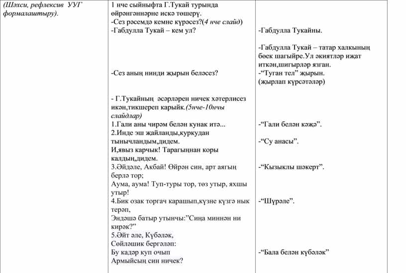· танып белү: әсәргә анализ ясау алымнары белән танышу, күренеп торган барлык катнашучыларны (персонажларны), таба белү; · регулятив: укытучы ярдәме белән әсәргә анализны планлаштыру, анализ ясау, эш сыйфатына бәя бирү; · коммуникатив: сорауларга җавап бирү,башкаларның сөйләмен тыңлап диалогта катнашу, үз фикерләрен әйтеп бирү; · шәхси: әсәргә анализ ясау өстендә балаларда әхлак сыйфатлар формалаштыру. Укучыларның уку эшчәнлеге (УУЭ): Шәхси. Үзмаксат кую. Регулятив. Белгәннәрне искә төшерү, аларны арттыру буенча эшләр эшләү. Коммуникатив. Классташлар һәм укытучы белән уку эшчәнлеген оештыруда хезмәттәшлек итү,бергәләп фикер алышуда катнашу. Танып белү. Танып –белү мәсьәләсен мөстәкыйль ачыклау һәм максат кую. |