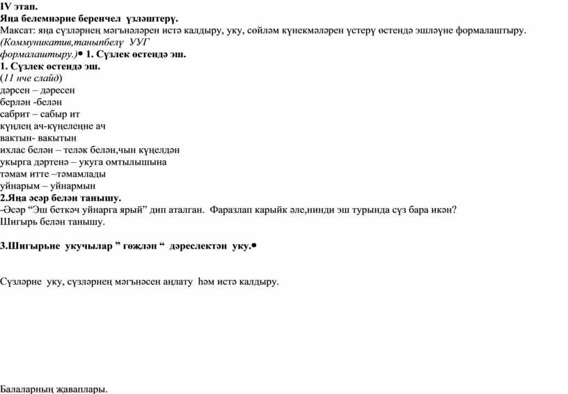 IV этап. Яңа белемнәрне беренчел үзләштерү. Максат: яңа сүзләрнең мәгънәләрен истә калдыру, уку, сөйләм күнекмәләрен үстерү өстендә эшләүне формалаштыру. (Коммуникатив,таныпбелү УУГ формалаштыру.) |