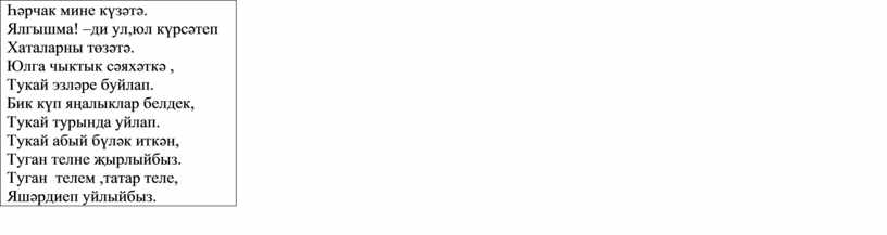 1 укучы укый. “ Шүрәле”, “ Су анасы “, Безнең якын дустыбыз. Тукай Әкиятен укып, Тәрбияле булырбыз. Тукай абый шигырьләрен Бик яратып укыйбыз. Аның кебек тырыш бала, Булырга тырышабыз. Рәсемнән Тукай абый, Һәрчак мине күзәтә. Ялгышма! –ди ул,юл күрсәтеп Хаталарны төзәтә. Юлга чыктык сәяхәткә , Тукай эзләре буйлап. Бик күп яңалыклар белдек, Тукай турында уйлап. Тукай абый бүләк иткән, Туган телне җырлыйбыз. Туган телем ,татар теле, Яшәрдиеп уйлыйбыз. |
