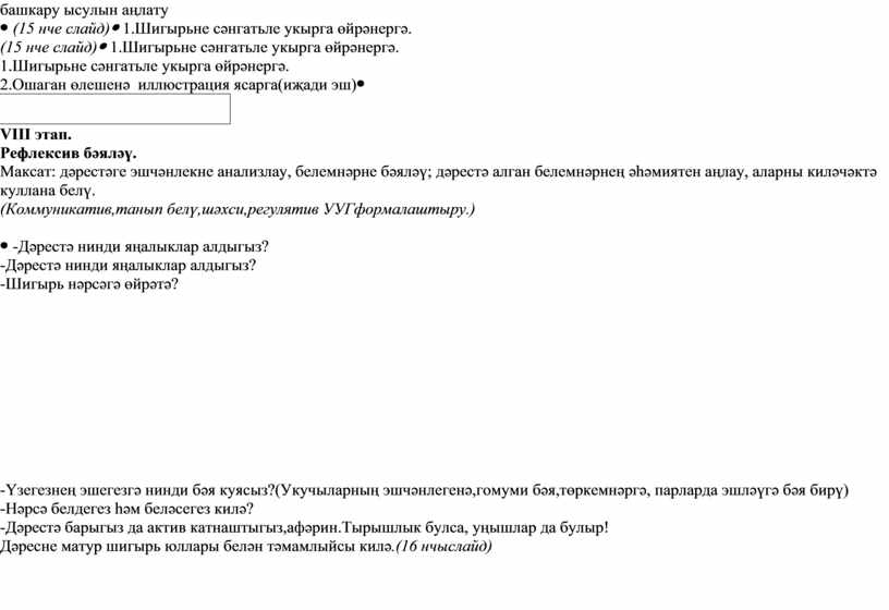 VIII этап. Рефлексив бәяләү. Максат: дәрестәге эшчәнлекне анализлау, белемнәрне бәяләү; дәрестә алган белемнәрнең әһәмиятен аңлау, аларны киләчәктә куллана белү. (Коммуникатив,танып белү,шәхси,регулятив УУГформалаштыру.)
