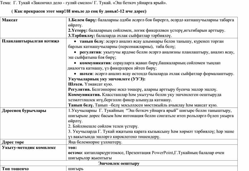 Тема: Г. Тукай «Закончил дело - гуляй смело»/ Г. Тукай. «Эш беткәч уйнарга ярый».