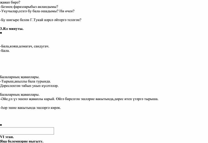 VI этап. Яңа белемнәрне ныгыту. Максат: укучыларның алган белемнәрен практик кулланырга мөмкинлек тудыру. (Коммуникатив,танып белү,шәхси,регулятив УУГформалаштыру.)