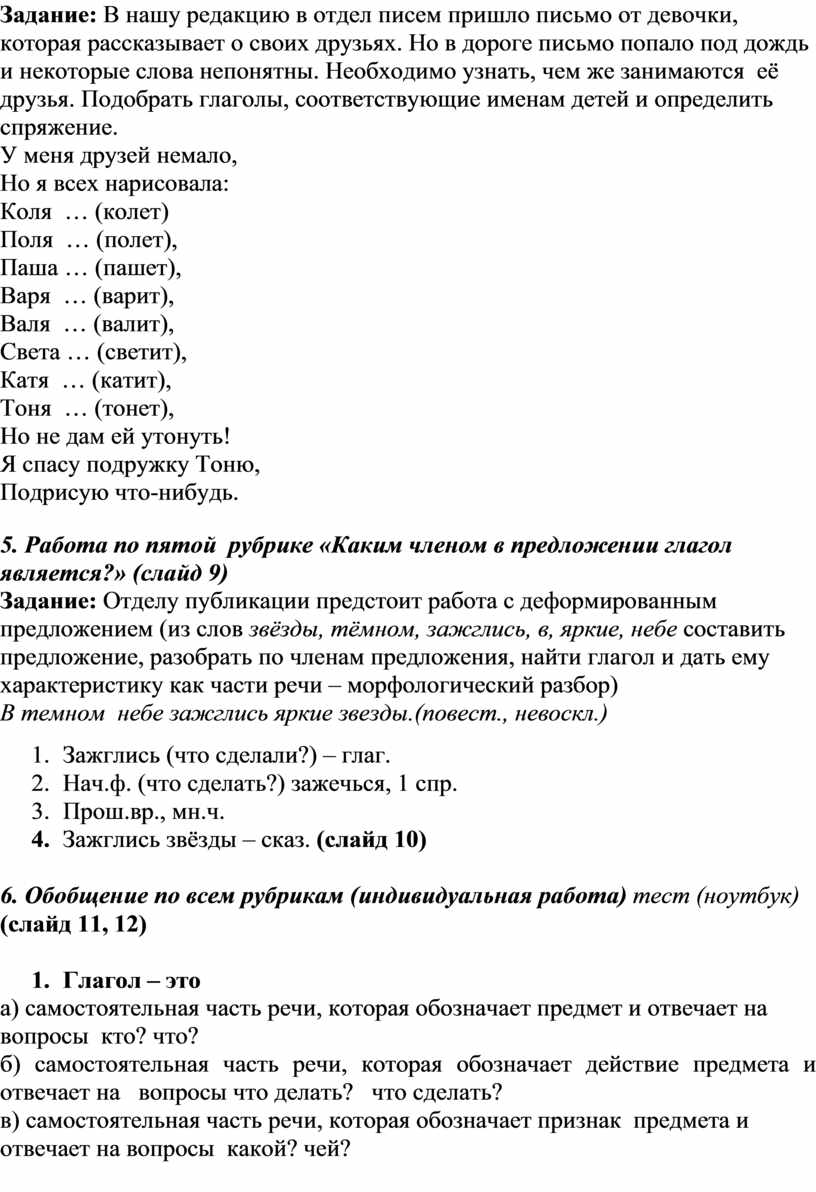 Задание: В нашу редакцию в отдел писем пришло письмо от девочки, которая рассказывает о своих друзьях. Но в дороге письмо попало под дождь и некоторые слова непонятны. Необходимо узнать, чем же занимаются её друзья. Подобрать глаголы, соответствующие именам детей и определить спряжение.