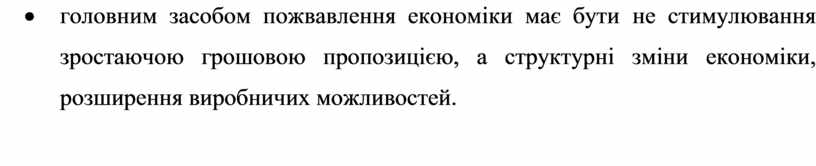· головним засобом пожвавлення економіки має бути не стимулювання зростаючою грошовою пропозицією, а структурні зміни економіки, розширення виробничих можливостей.