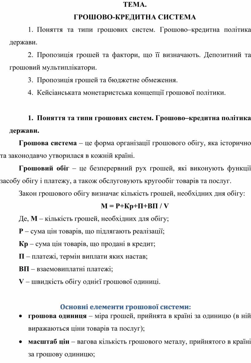 1. Поняття та типи грошових систем. Грошово–кредитна політика держави.