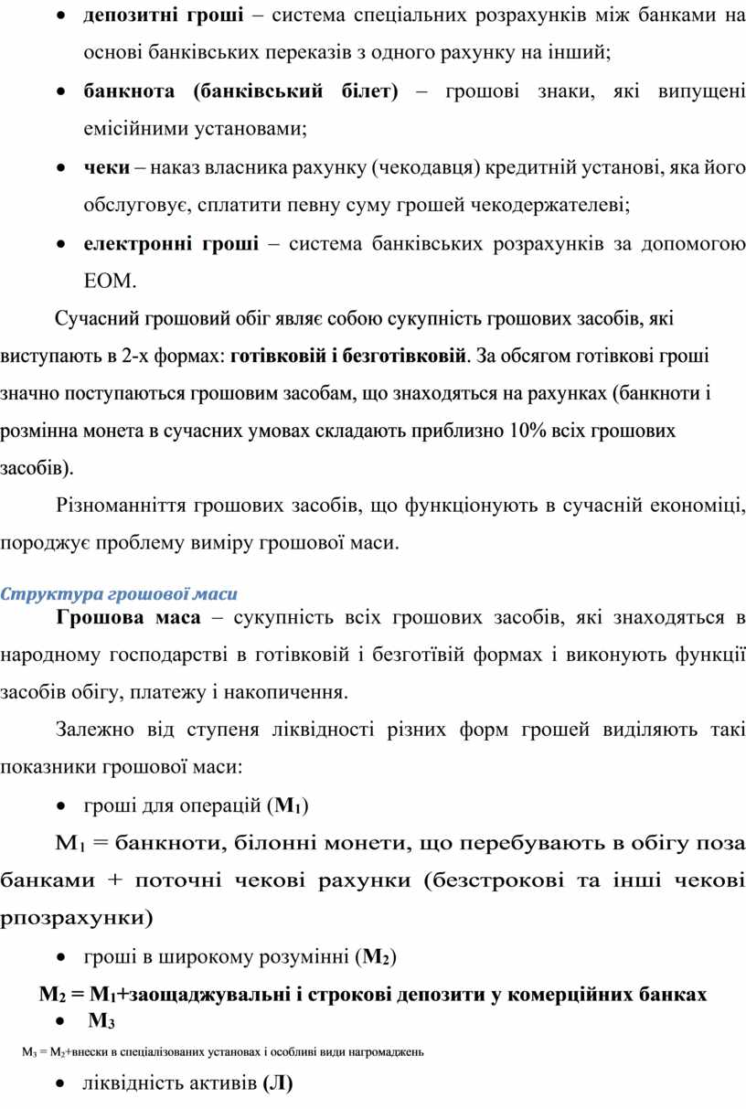 М1 = банкноти, білонні монети, що перебувають в обігу поза банками + поточні чекові рахунки (безстрокові та інші чекові рпозрахунки)