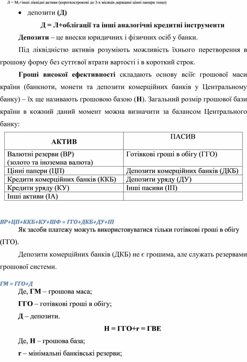 Гроші високої ефективності складають основу всіїє грошової маси країни (банкноти, монети та депозити комерційних банків у Центральному банку) – їх ще називають грошовою базою (Н). Загальний розмір грошової бази країни в кожний даний момент можна визначити за балансом Центрального банку: