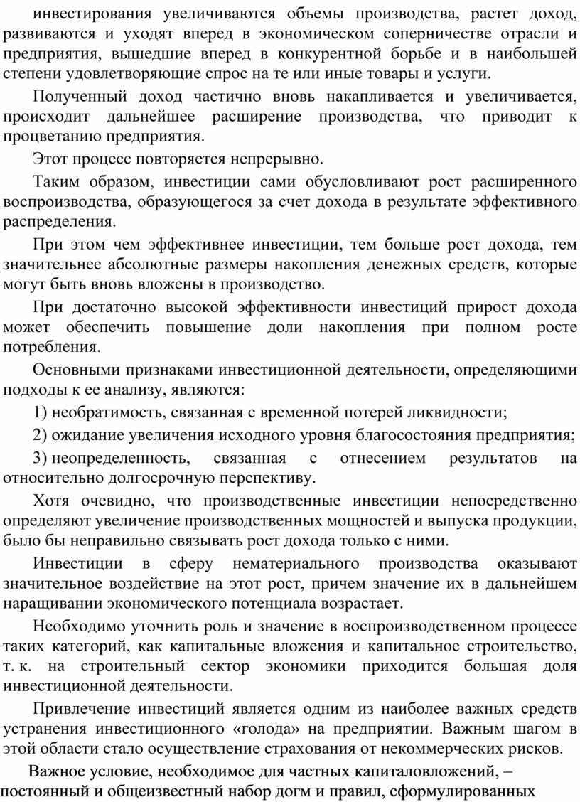 Инвестиции занимают центральное место в экономическом процессе и предопределяют общий рост экономики предприятия. В результате инвестирования увеличиваются объемы производства, растет доход, развиваются и уходят вперед в экономическом соперничестве отрасли и предприятия, вышедшие вперед в конкурентной борьбе и в наибольшей степени удовлетворяющие спрос на те или иные товары и услуги.