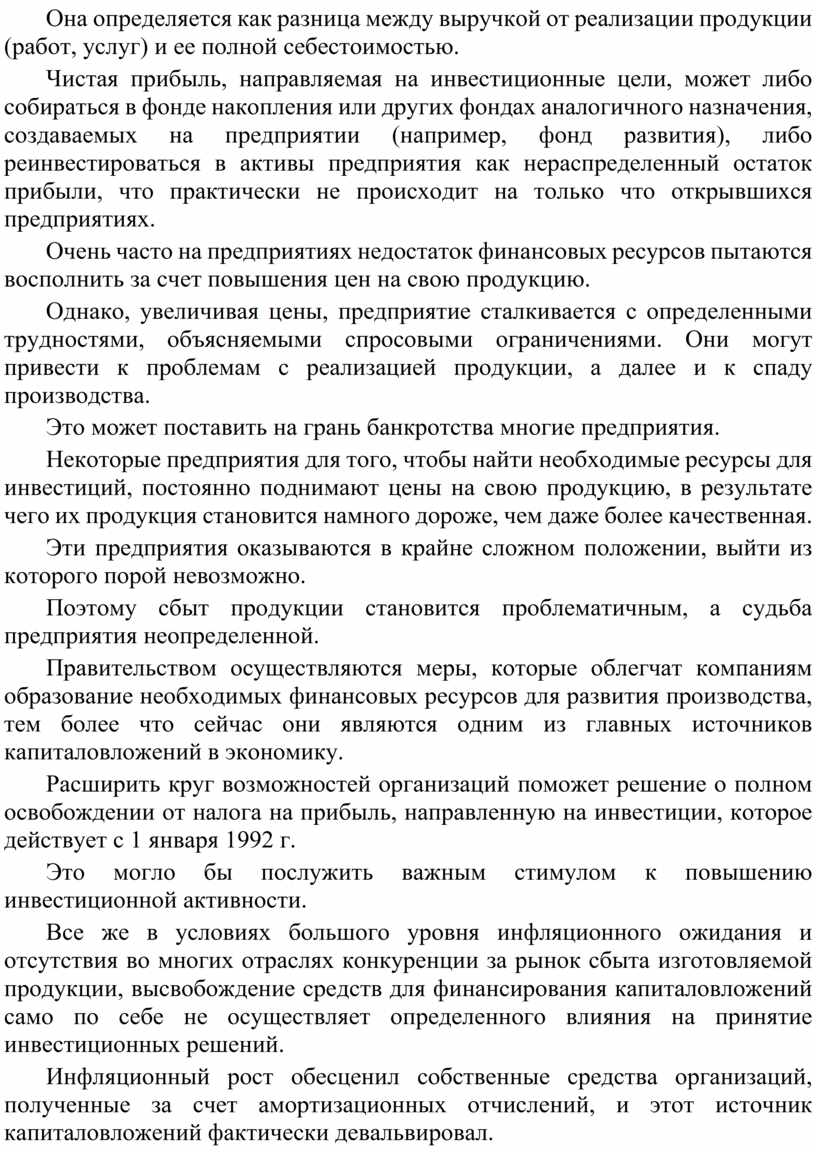 Все же в условиях большого уровня инфляционного ожидания и отсутствия во многих отраслях конкуренции за рынок сбыта изготовляемой продукции, высвобождение средств для финансирования капиталовложений само по себе не осуществляет определенного влияния на принятие инвестиционных решений.