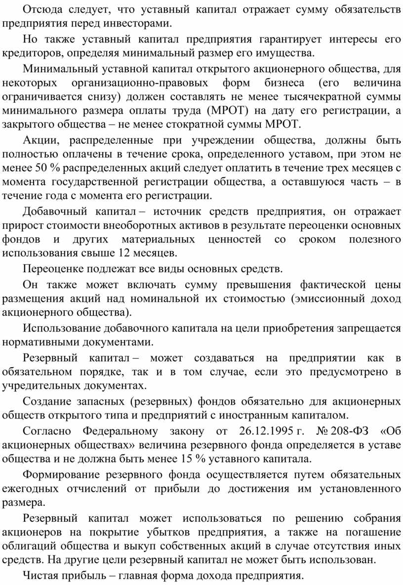 Согласно Федеральному закону от 26.12.1995 г. № 208-ФЗ «Об акционерных обществах» величина резервного фонда определяется в уставе общества и не должна быть менее 15 % уставного капитала.