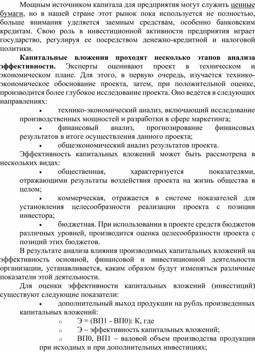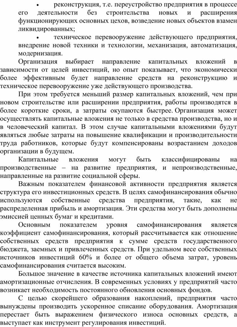 Организация выбирает направление капитальных вложений в зависимости от целей инвестиций, но опыт показывает, что экономически более эффективным будет направление средств на реконструкцию и техническое перевооружение уже действующего производства.