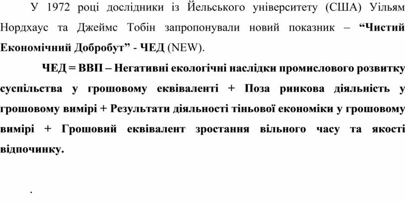У 1972 році дослідники із Йельського університету (США) Уільям Нордхаус та Джеймс Тобін запропонували новий показник – “Чистий Економічний Добробут” - ЧЕД (NEW).