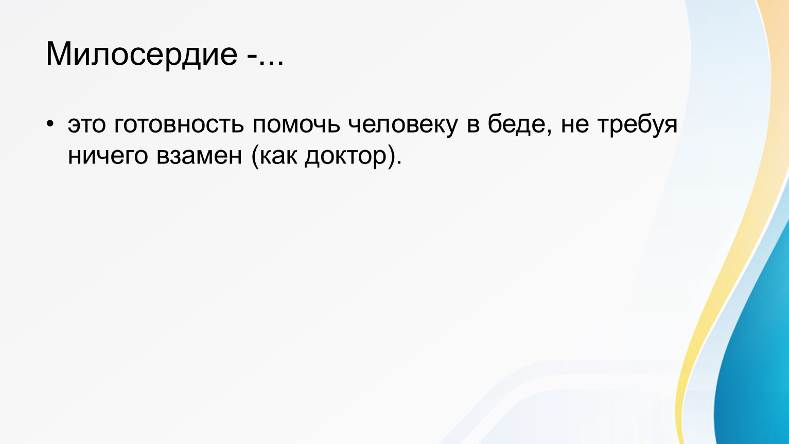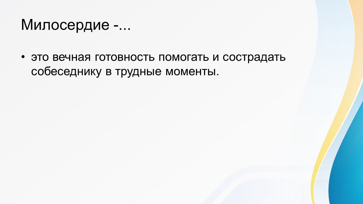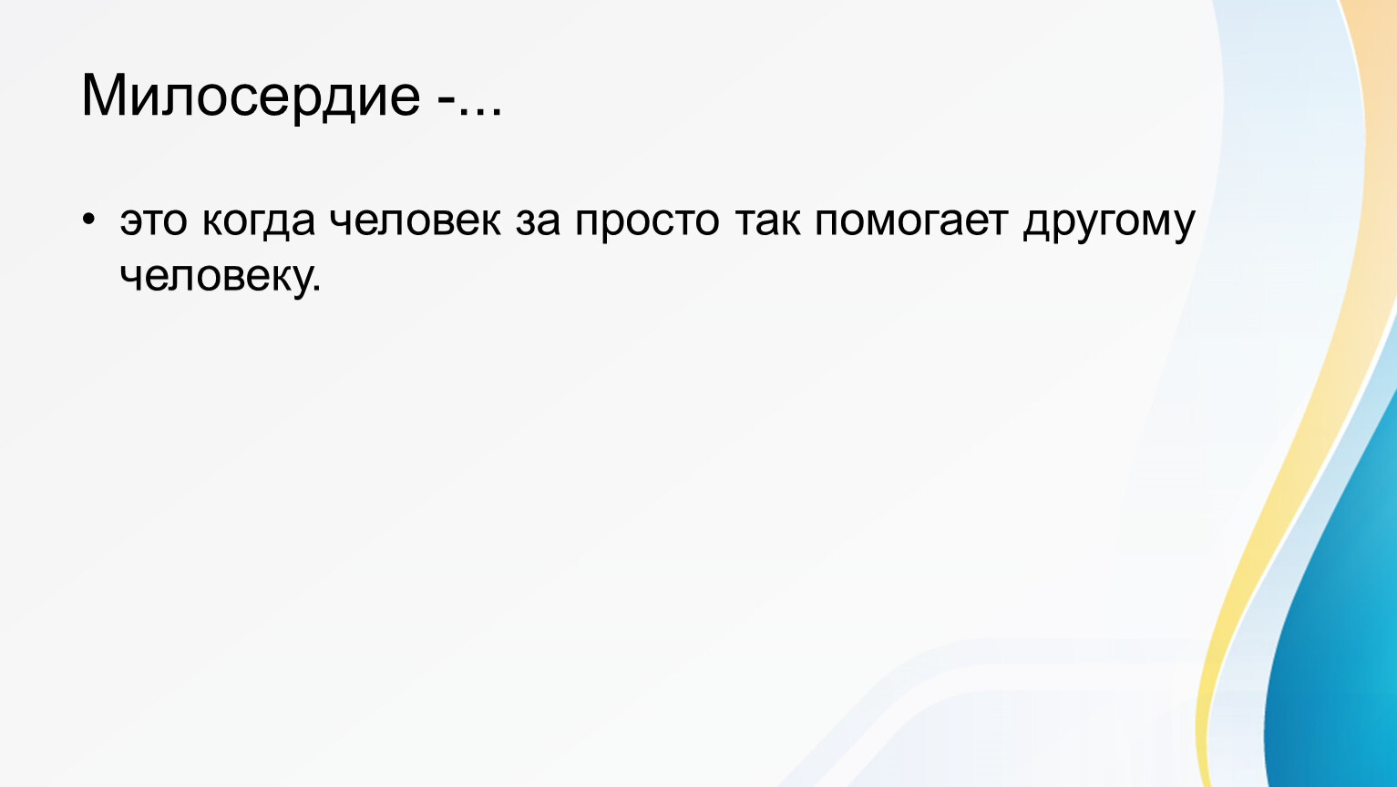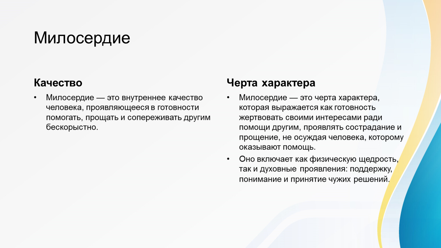 Милосердие — это внутреннее качество человека, проявляющееся в готовности помогать, прощать и сопереживать другим бескорыстно.
