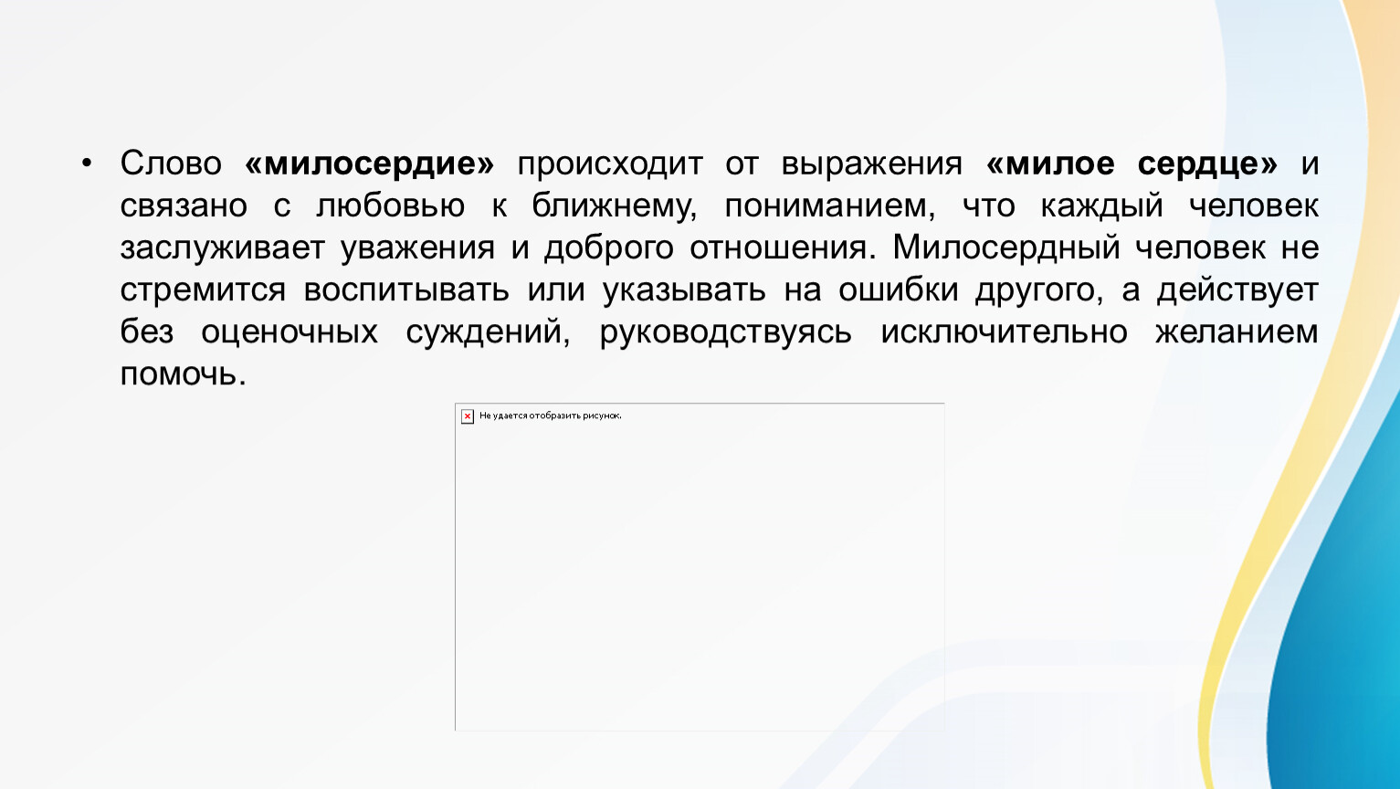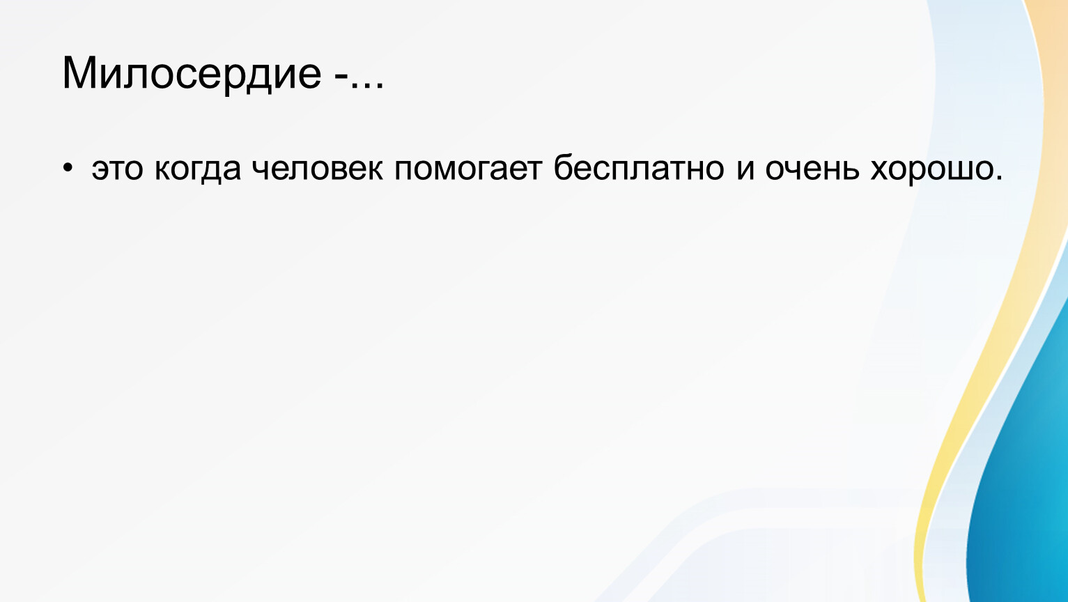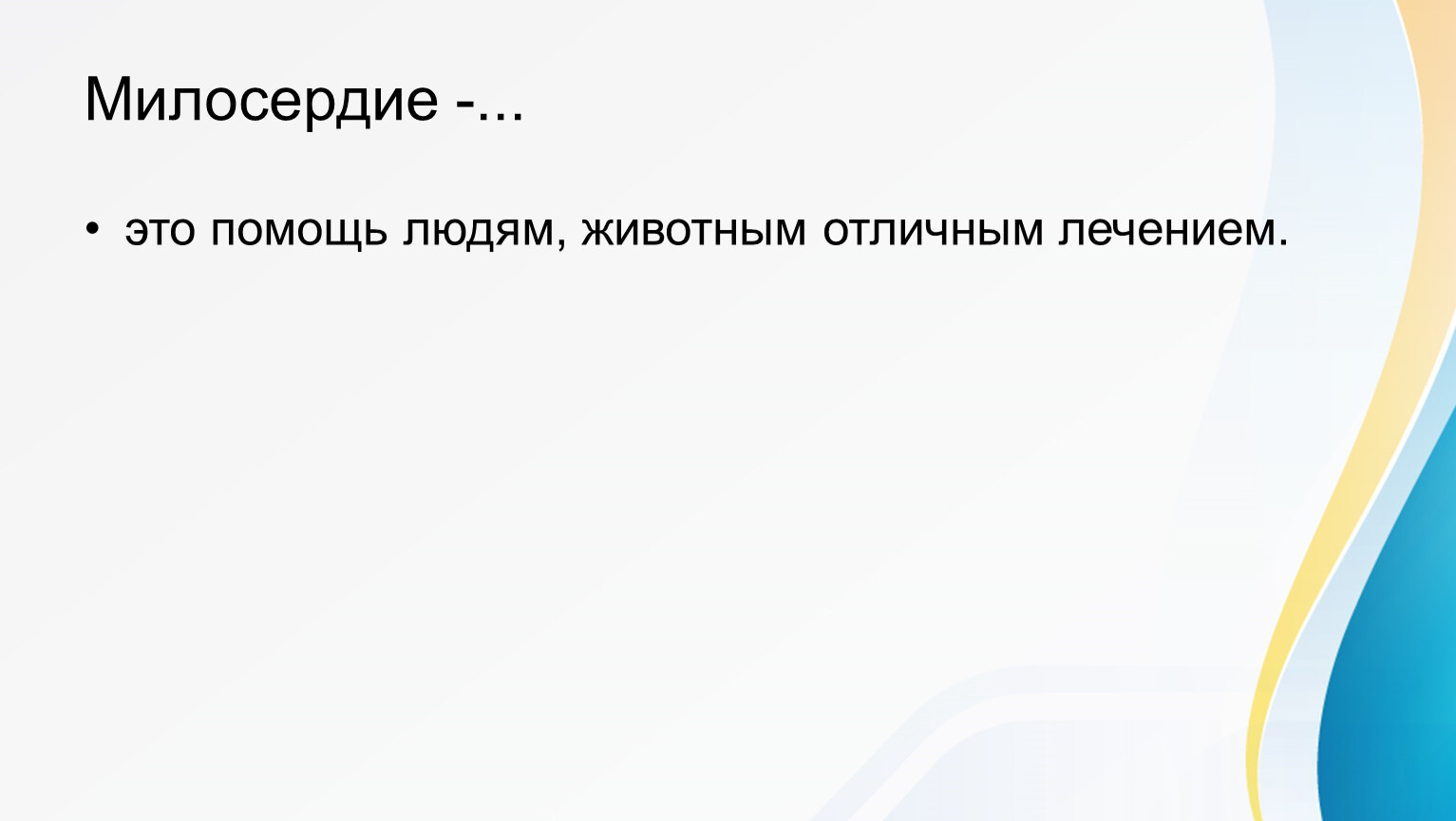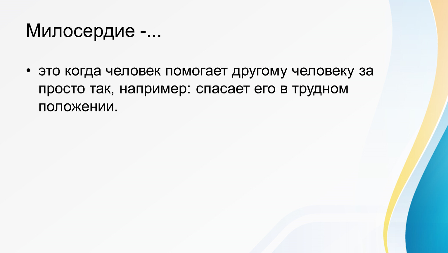 Милосердие — это внутреннее качество человека, проявляющееся в готовности помогать, прощать и сопереживать другим бескорыстно.