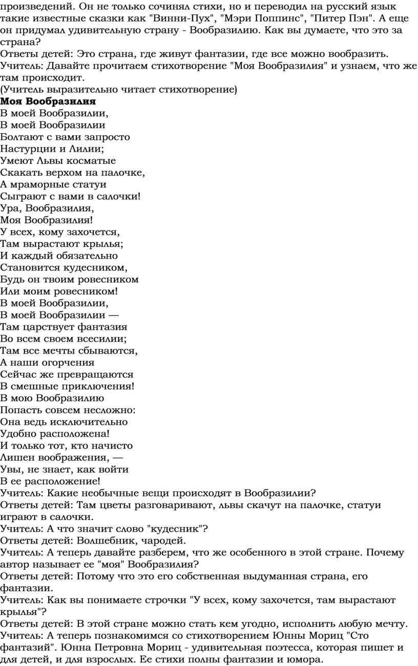 Учитель: Сегодня мы познакомимся с двумя замечательными поэтами - Борисом Заходером и Юнной Мориц. Борис Владимирович Заходер - известный детский писатель и поэт, который подарил нам множество чудесных произведений. Он не только сочинял стихи, но и переводил на русский язык такие известные сказки как "Винни-Пух", "Мэри Поппинс", "Питер Пэн". А еще он придумал удивительную страну - Вообразилию. Как вы думаете, что это за страна?