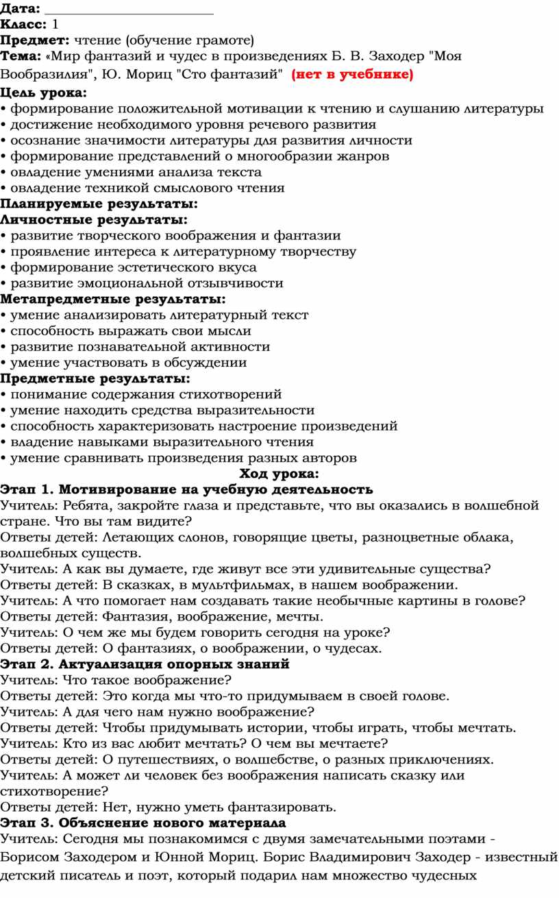 Тема: «Мир фантазий и чудес в произведениях Б. В. Заходер "Моя Вообразилия", Ю. Мориц "Сто фантазий" (нет в учебнике)
