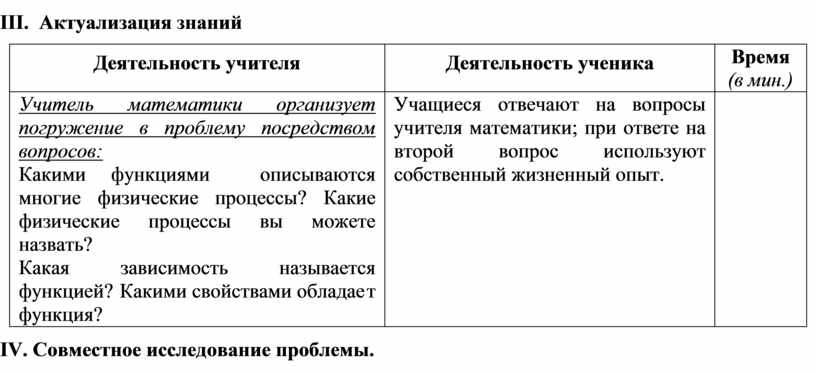 Учитель математики организует погружение в проблему посредством вопросов: Какими функциями описываются многие физические процессы? Какие физические процессы вы можете назвать? Какая зависимость называется функцией? Какими свойствами обладает функция? |