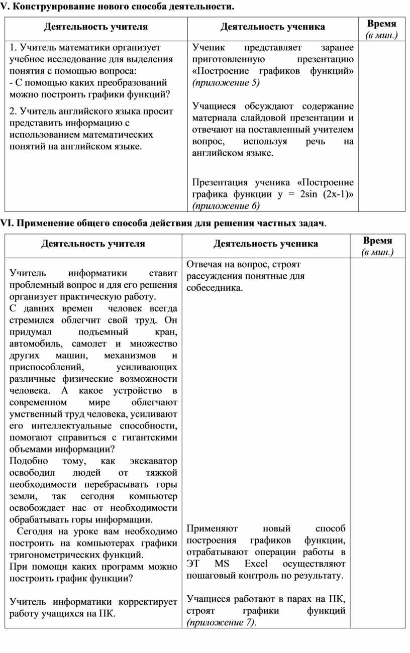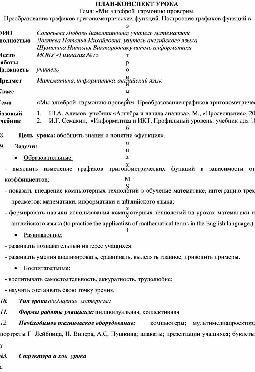 1. Учитель математики организует учебное исследование для выделения понятия с помощью вопроса: - С помощью каких преобразований можно построить графики функций? 2. Учитель английского языка просит представить информацию с использованием математических понятий на английском языке.