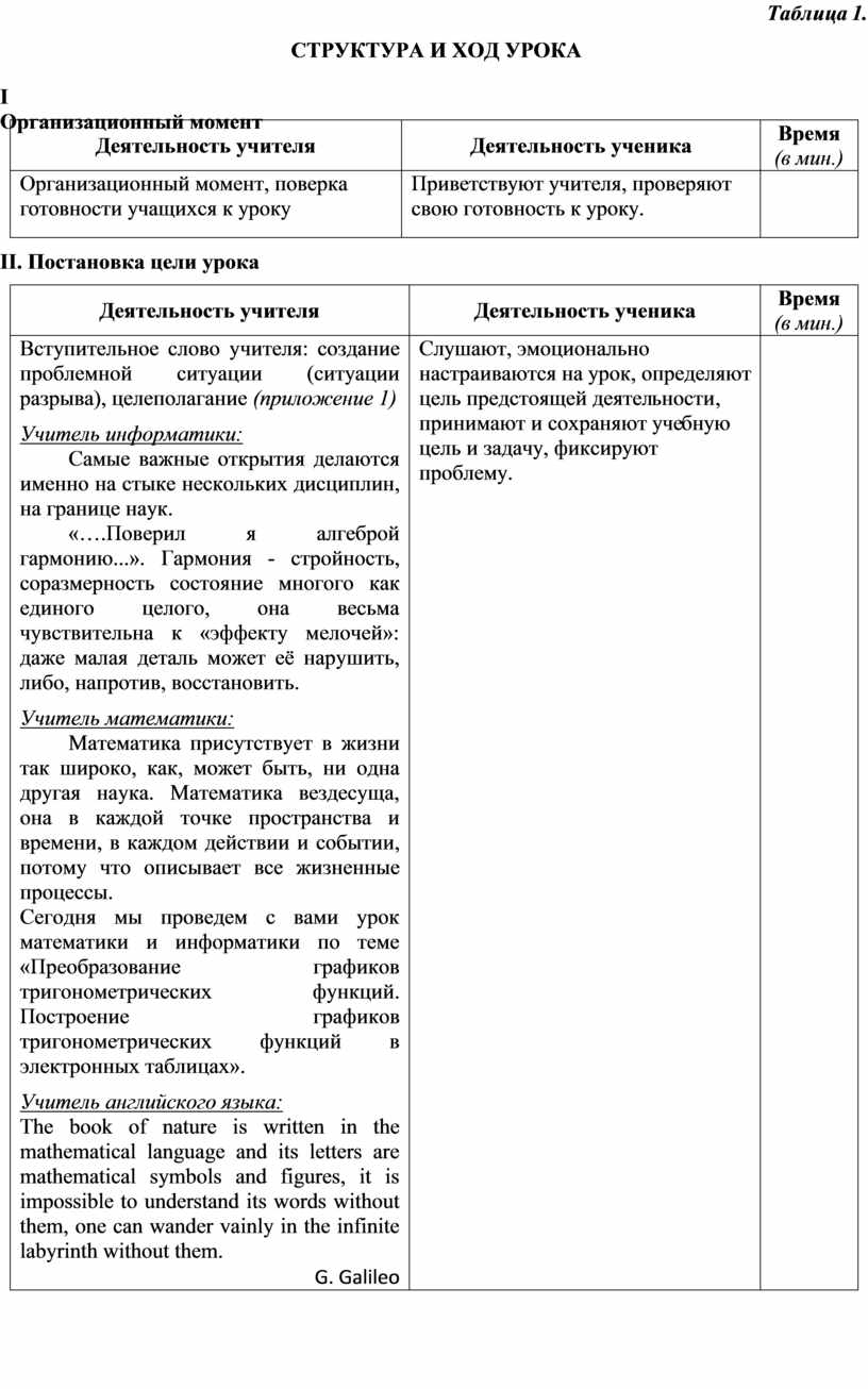 Вступительное слово учителя: создание проблемной ситуации (ситуации разрыва), целеполагание (приложение 1) Учитель информатики: Самые важные открытия делаются именно на стыке нескольких дисциплин, на границе наук. «….Поверил я алгеброй гармонию...». Гармония - стройность, соразмерность состояние многого как единого целого, она весьма чувствительна к «эффекту мелочей»: даже малая деталь может её нарушить, либо, напротив, восстановить. Учитель математики: Математика присутствует в жизни так широко, как, может быть, ни одна другая наука. Математика вездесуща, она в каждой точке пространства и времени, в каждом действии и событии, потому что описывает все жизненные процессы. Сегодня мы проведем с вами урок математики и информатики по теме «Преобразование графиков тригонометрических функций. Построение графиков тригонометрических функций в электронных таблицах». Учитель английского языка: The book of nature is written in the mathematical language and its letters are mathematical symbols and figures, it is impossible to understand its words without them, one can wander vainly in the infinite labyrinth without them. G. Galileo |