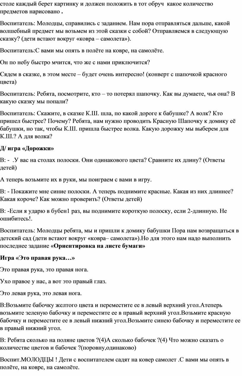 Воспитатель: Скажите, в сказке К.Ш. шла, по какой дороге к бабушке? А волк? Кто пришел быстрее? Почему? Ребята, нам нужно проводить Красную Шапочку к домику её бабушки, но так, чтобы К.Ш. пришла быстрее волка. Какую дорожку мы выберем для К.Ш.? А для волка?