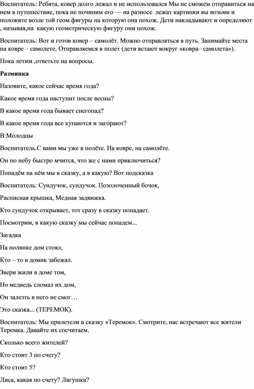Воспитатель.С вами мы уже в полёте. На ковре, на самолёте.