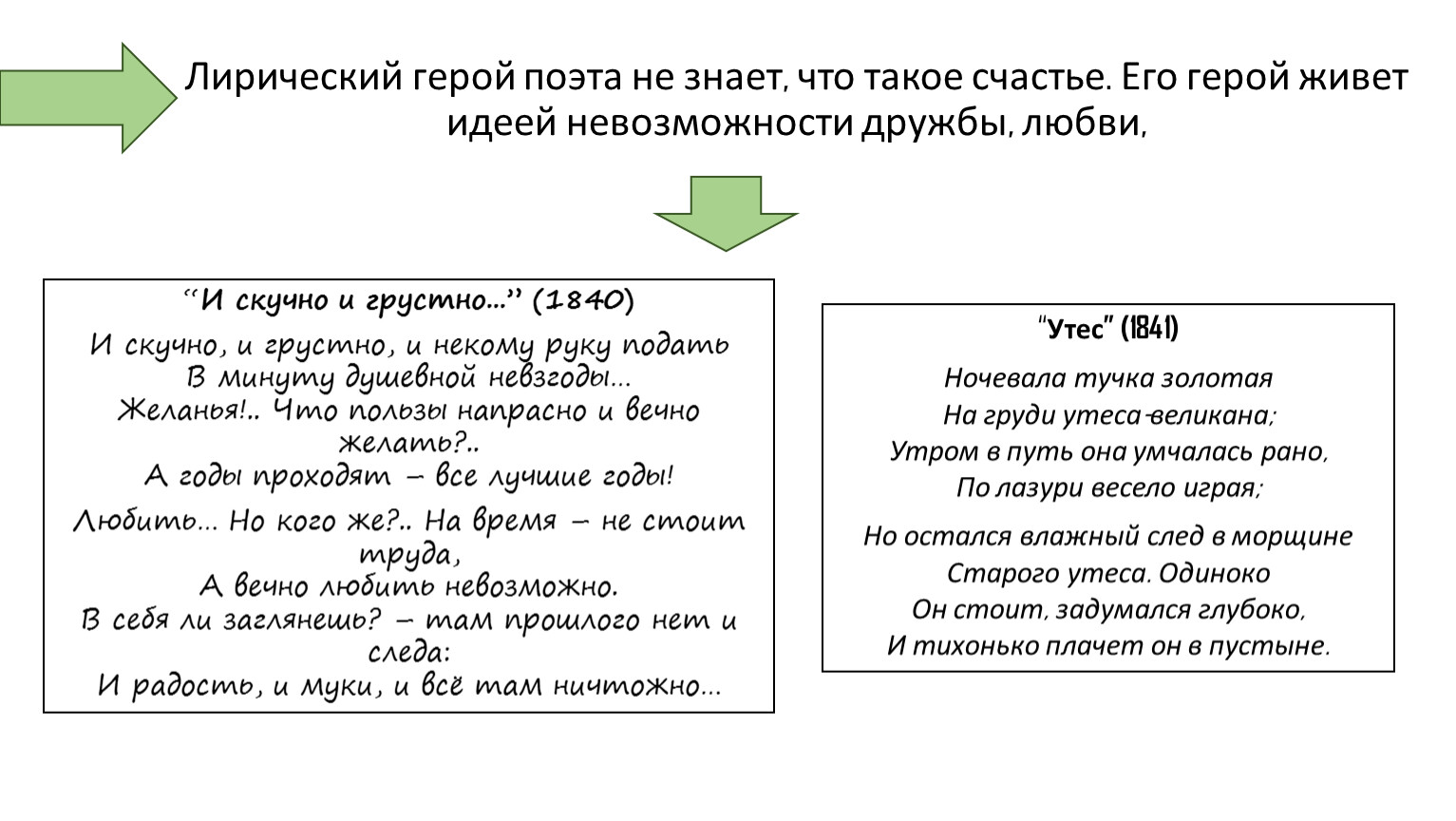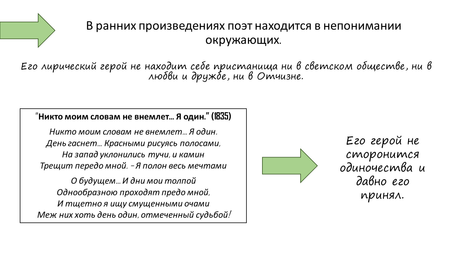 Его лирический герой не находит себе пристанища ни в светском обществе, ни в любви и дружбе, ни в Отчизне.
